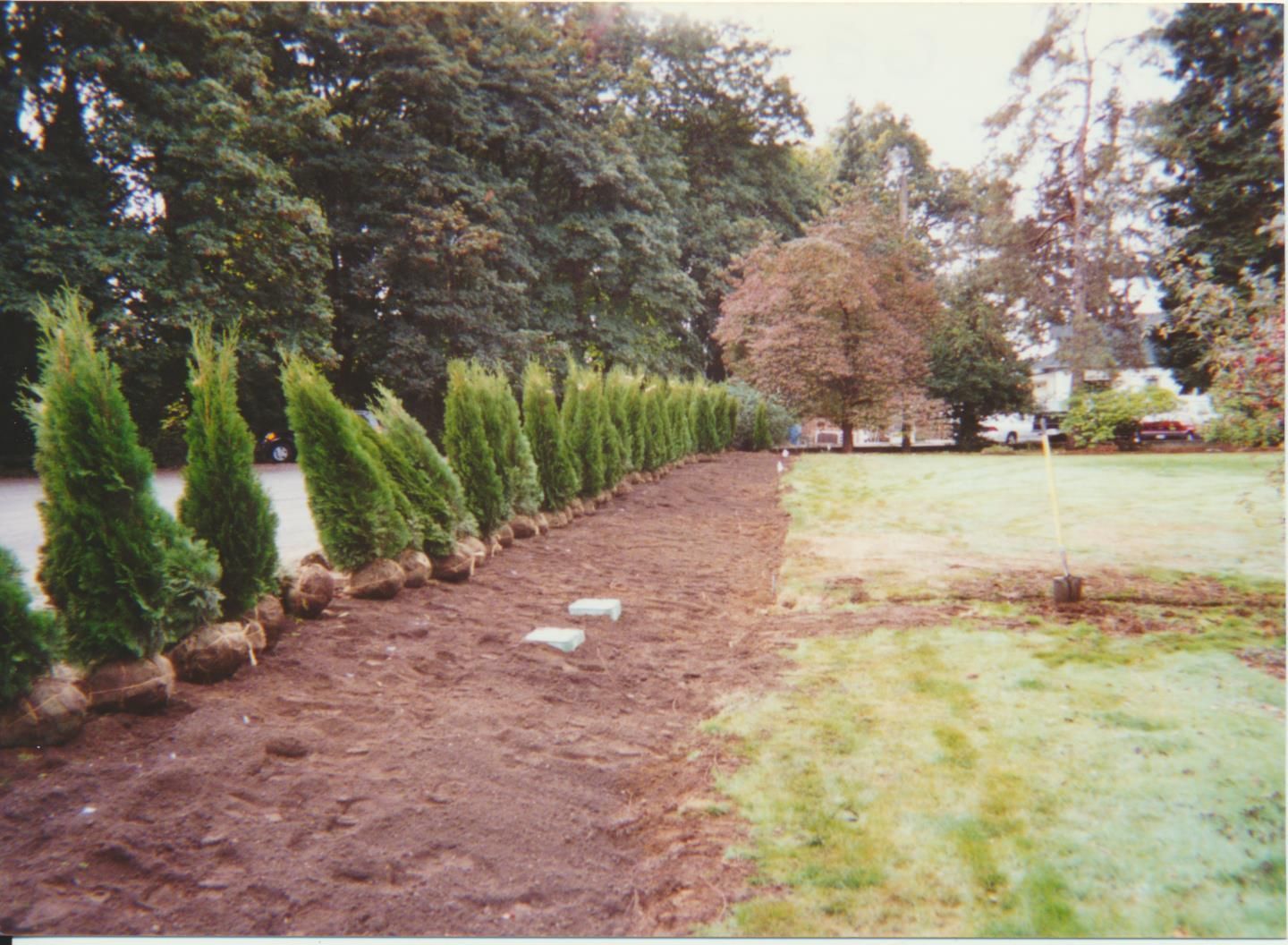 Photograph. 4 3/ 4 x 3 1/2 color. Schmidt House restoration done in October 2001. Photo by Vida Zvirzdys-Farler. Planting new arborvitae hedge.