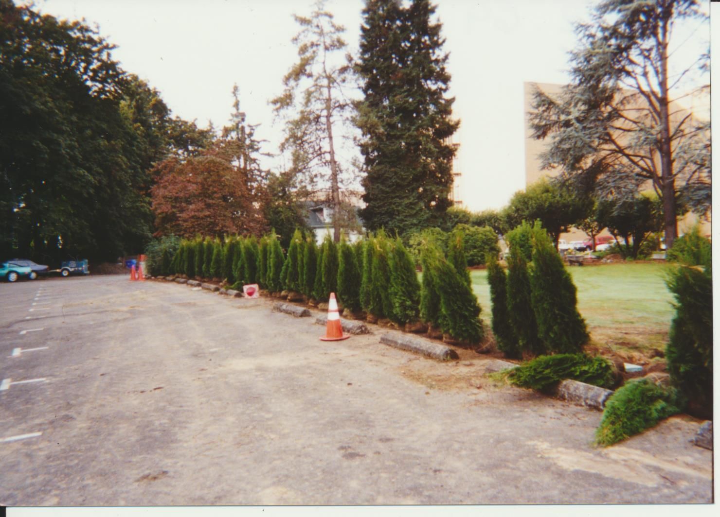 Photograph. 4 3/ 4 x 3 1/2 color. Schmidt House restoration done in October 2001. Photo by Vida Zvirzdys-Farler. Planting new arborvitae hedge.