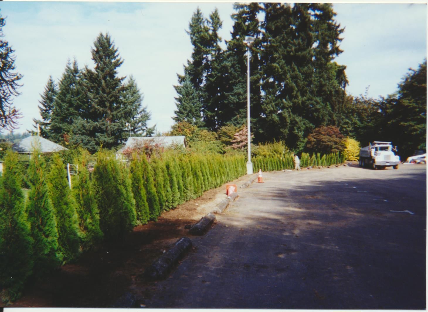 Photograph. 4 3/ 4 x 3 1/2 color. Schmidt House restoration done in October 2001. Photo by Vida Zvirzdys-Farler. Planting new arborvitae hedge.