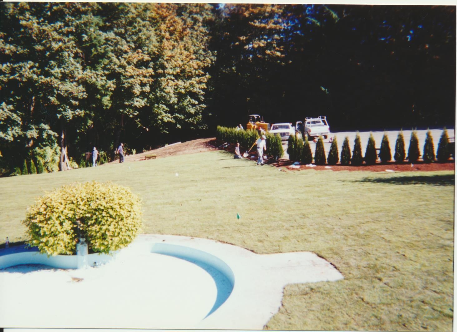 Photograph. 4 3/ 4 x 3 1/2 color. Schmidt House restoration done in October 2001. Photo by Vida Zvirzdys-Farler. Planting new arborvitae hedge.