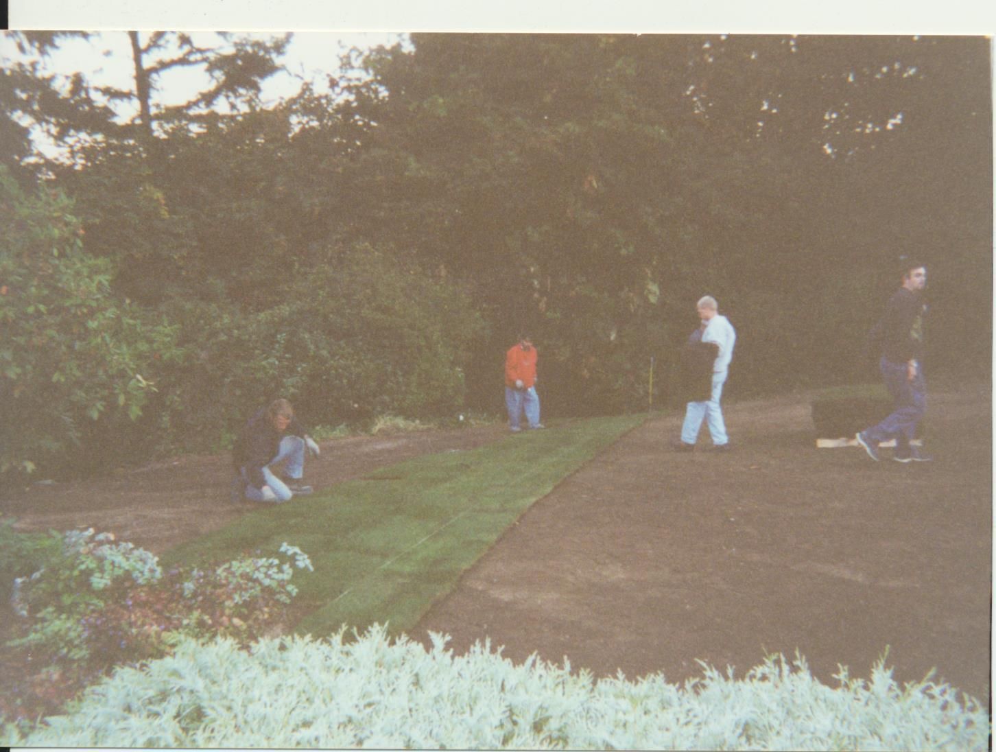 Photograph. 4 3/ 4 x 3 1/2 color. Schmidt House restoration done in October 2001. Photo by Vida Zvirzdys-Farler. Sod for northeast yard.