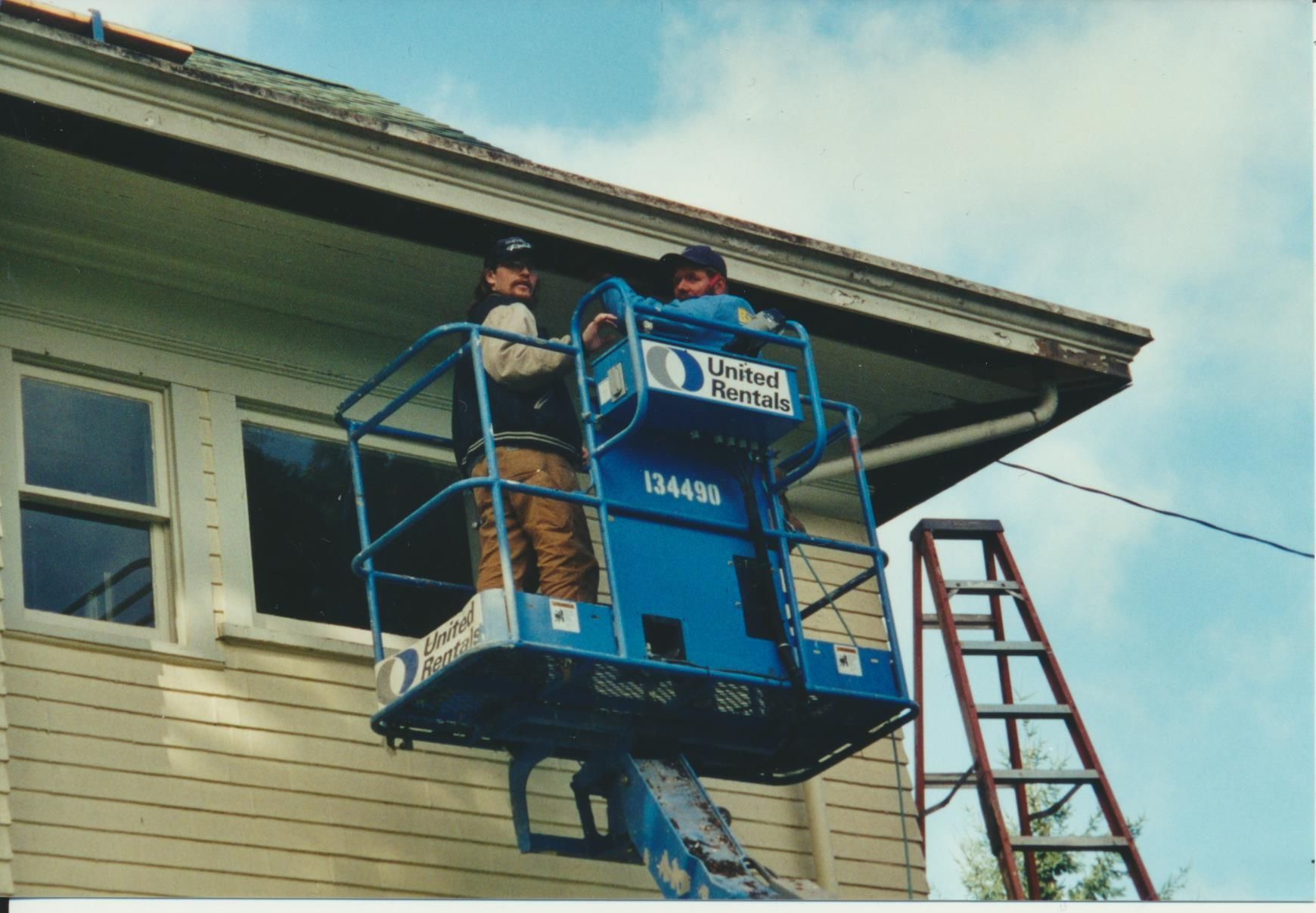Photograph. 5 3/ 4 x 4 color. Schmidt House restoration done in October 2001. Photo by Vida Zvirzdys-Farler. Roof work on house.