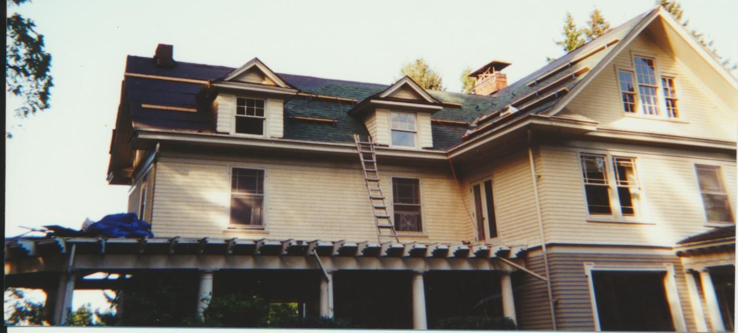 Photograph. 4 3/ 4 x 3 1/2 color. Schmidt House restoration done in October 2001. Photo by Vida Zvirzdys-Farler. Roof work on house.