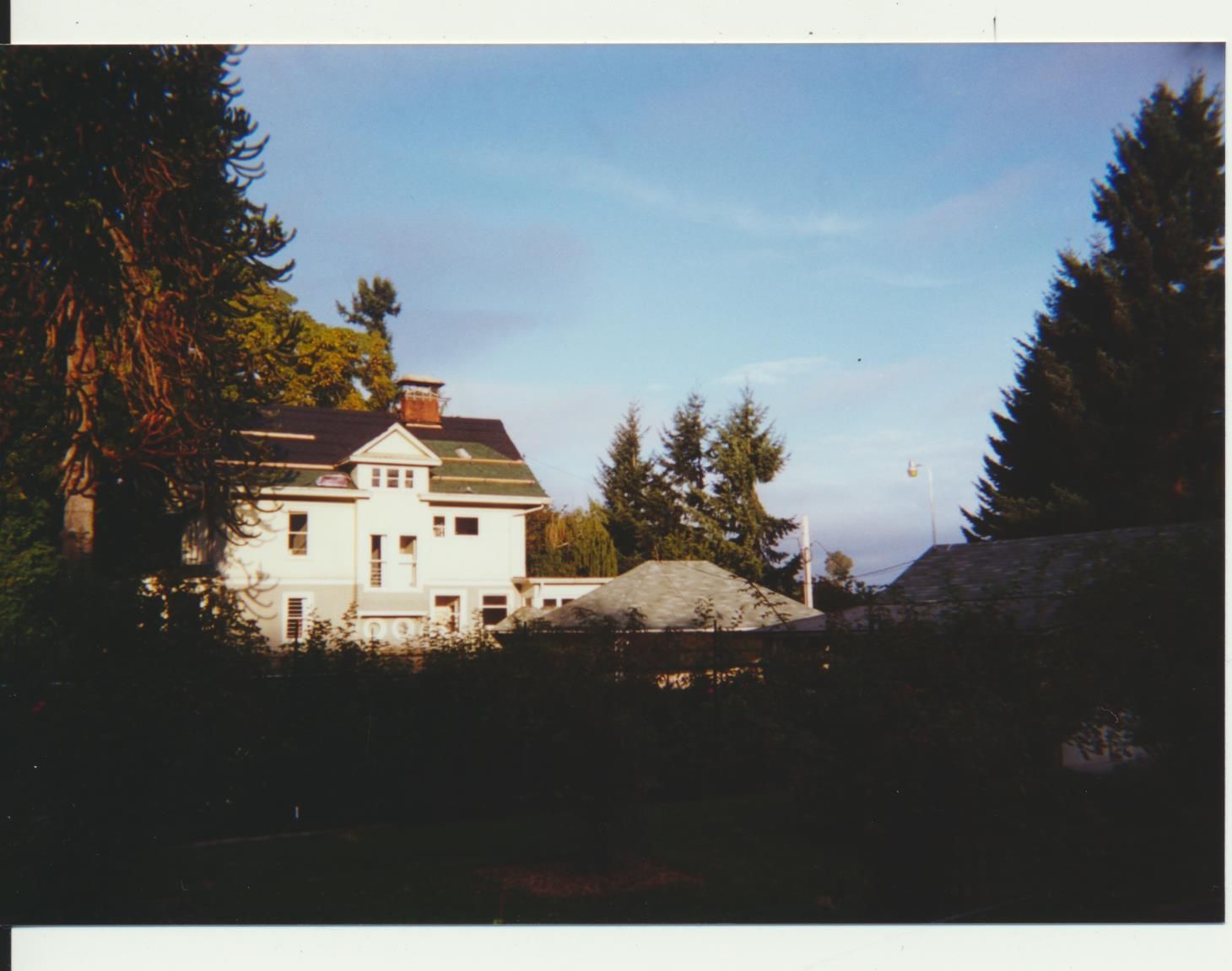 Photograph. 4 3/ 4 x 3 1/2 color. Schmidt House restoration done in October 2001. Photo by Vida Zvirzdys-Farler. Roof work on house.