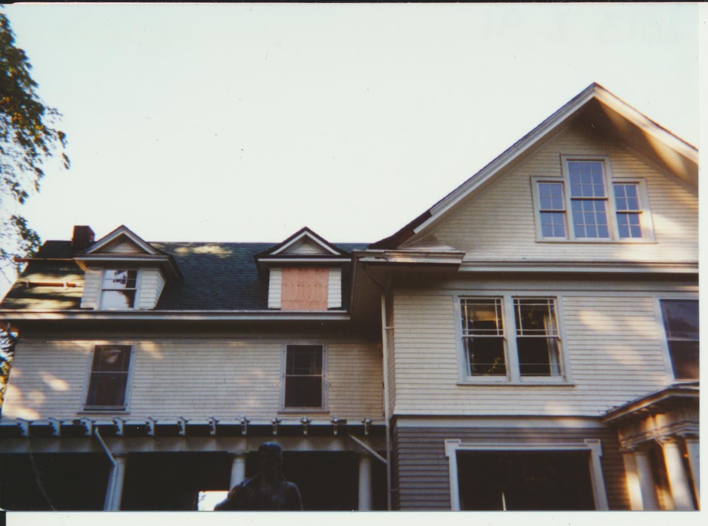 Photograph. 4 3/ 4 x 3 1/2 color. Schmidt House restoration done in October 2001. Photo by Vida Zvirzdys-Farler. Roof work on house.
