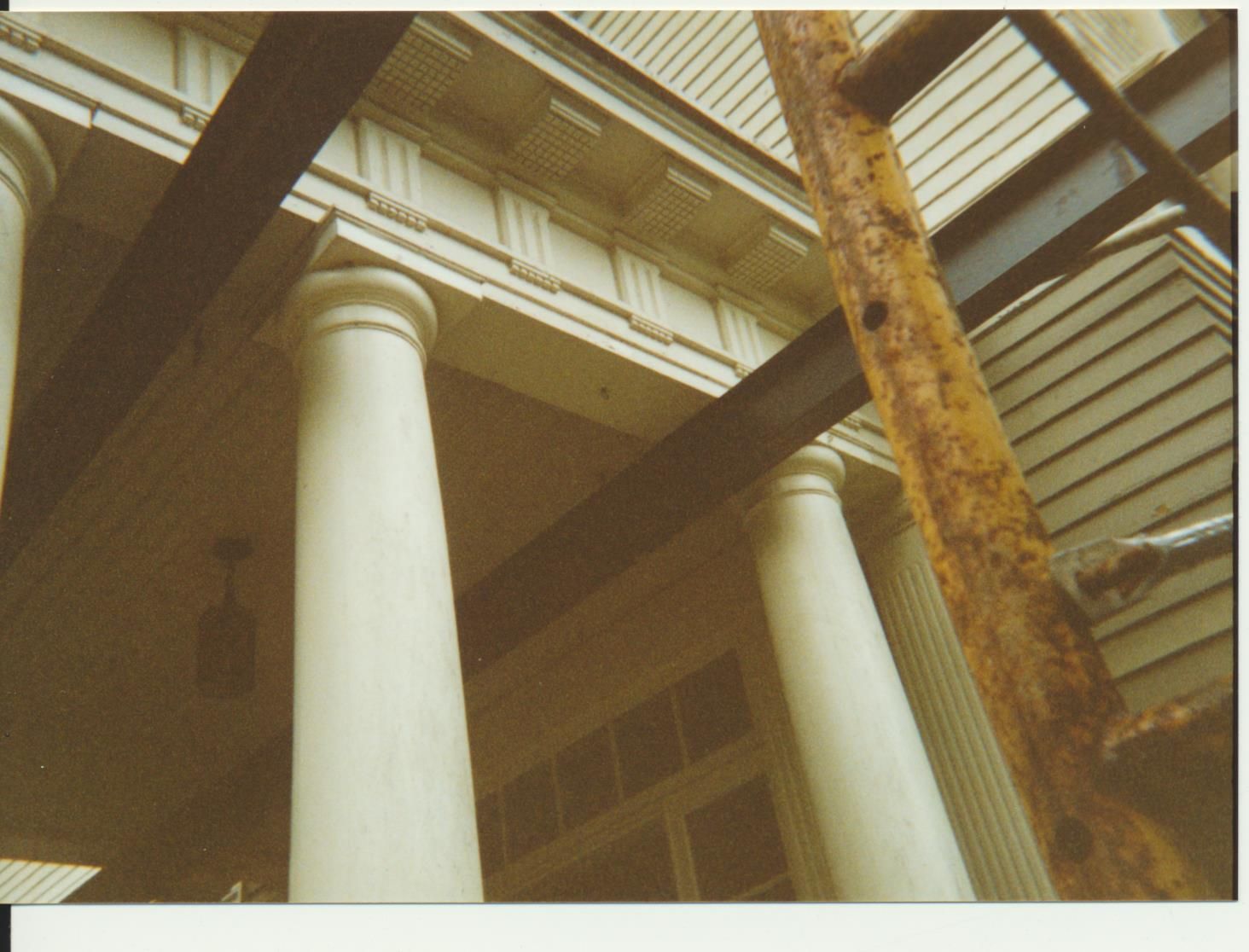 Photograph. 4 3/ 4 x 3 1/2 color. Schmidt House restoration done in December 2001. Photo by Vida Zvirzdys-Farler. Front view of house, porch reconstruction.