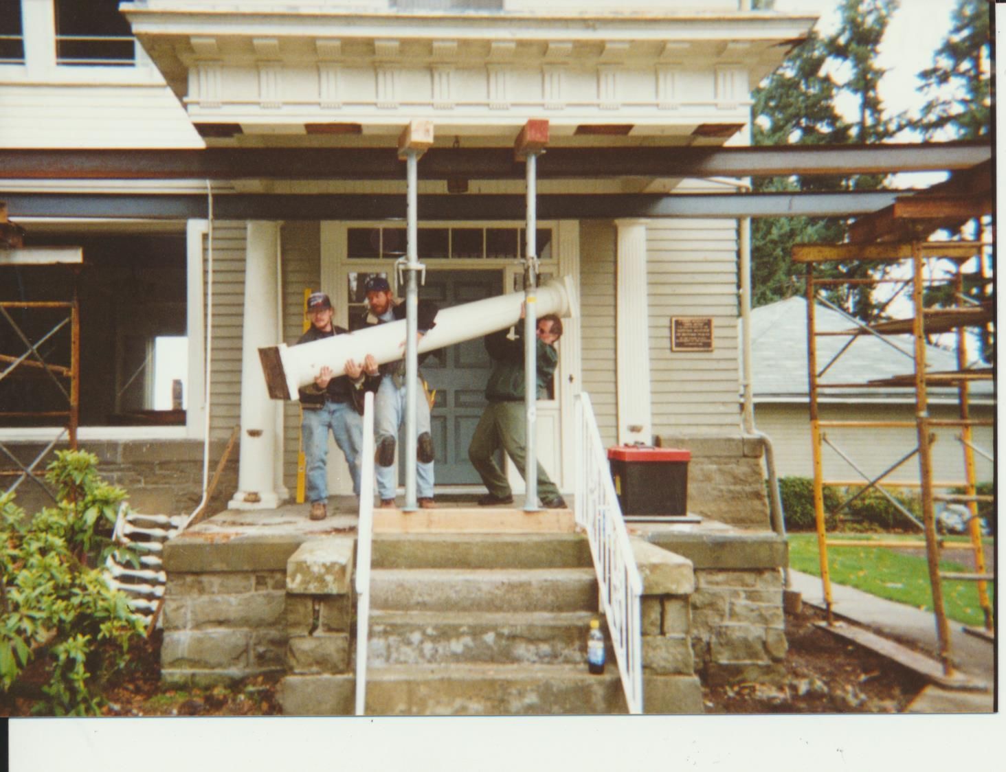 Photograph. 4 3/ 4 x 3 1/2 color. Schmidt House restoration done in December 2001. Photo by Vida Zvirzdys-Farler. Front view of house, porch reconstruction.
