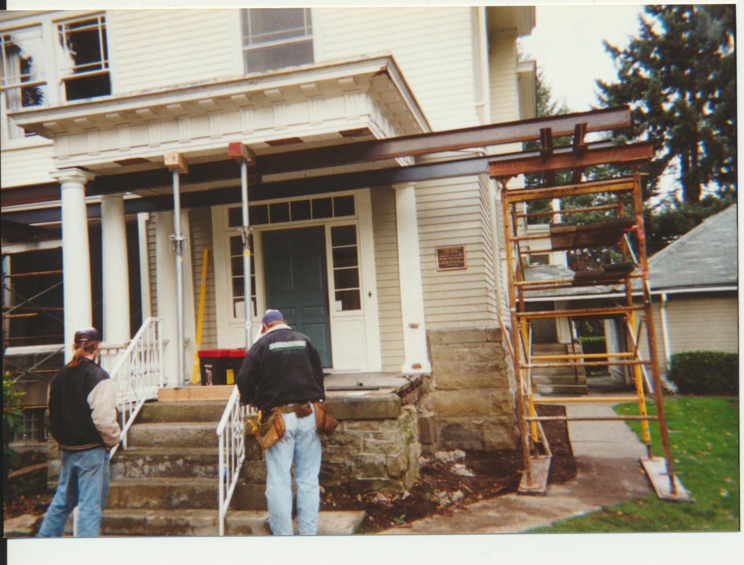 Photograph. 4 3/ 4 x 3 1/2 color. Schmidt House restoration done in December 2001. Photo by Vida Zvirzdys-Farler. Front view of house, porch reconstruction.