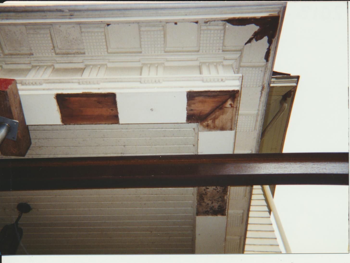 Photograph. 4 3/ 4 x 3 1/2 color. Schmidt House restoration done in December 2001. Photo by Vida Zvirzdys-Farler. Front view of house, porch reconstruction.