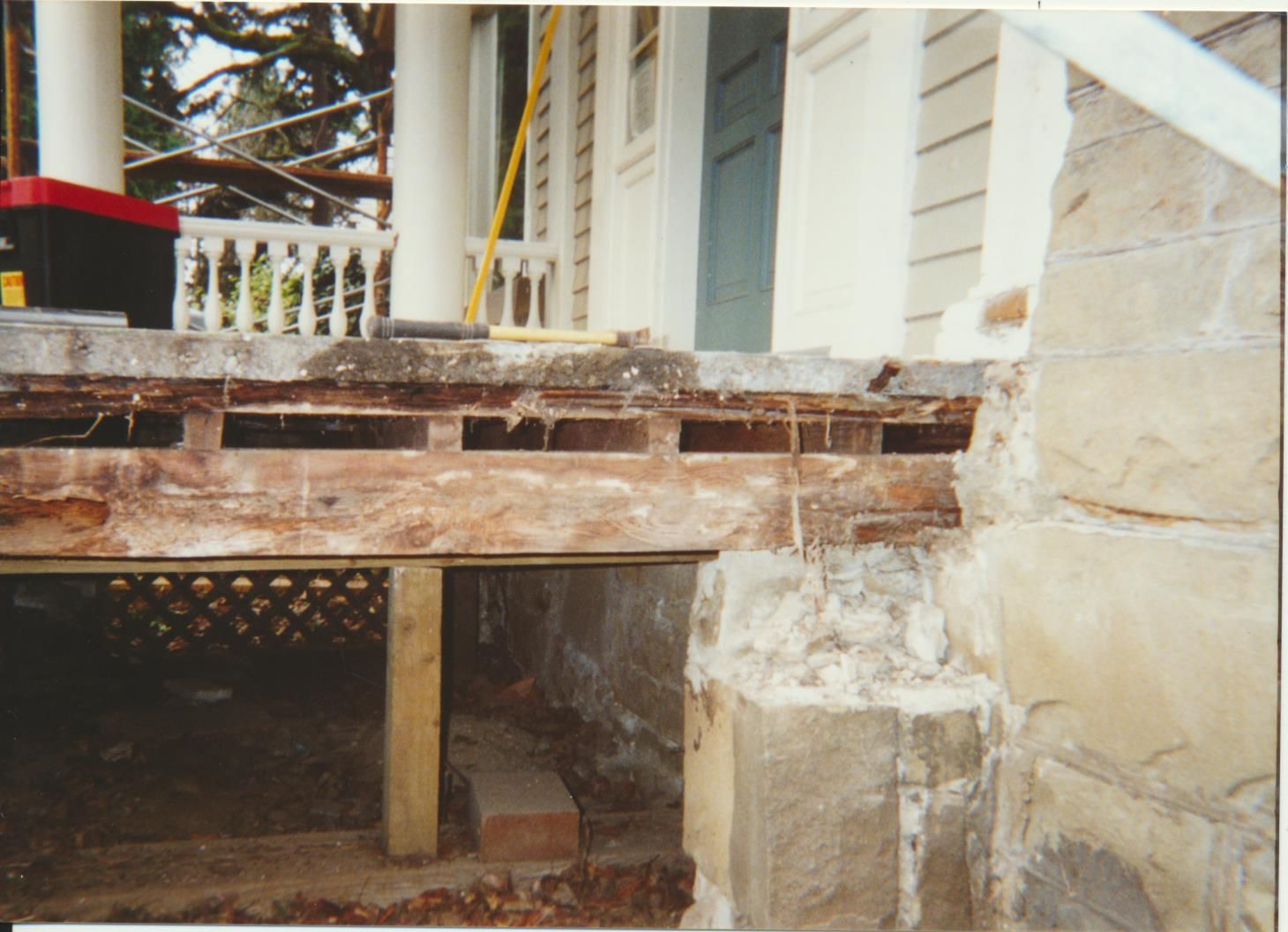 Photograph. 4 3/ 4 x 3 1/2 color. Schmidt House restoration done in December 2001. Photo by Vida Zvirzdys-Farler. Front view of house, porch reconstruction.