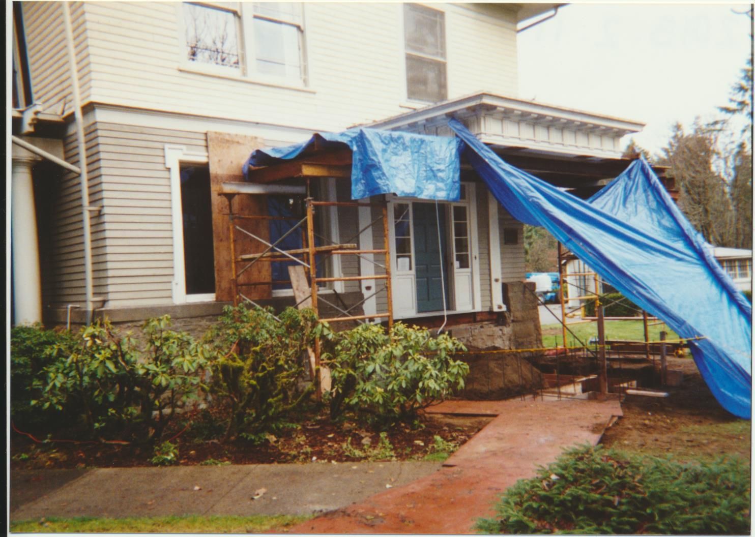 Photograph. 4 3/ 4 x 3 1/2 color. Schmidt House restoration done in December 2001. Photo by Vida Zvirzdys-Farler. Front view of house, porch reconstruction.