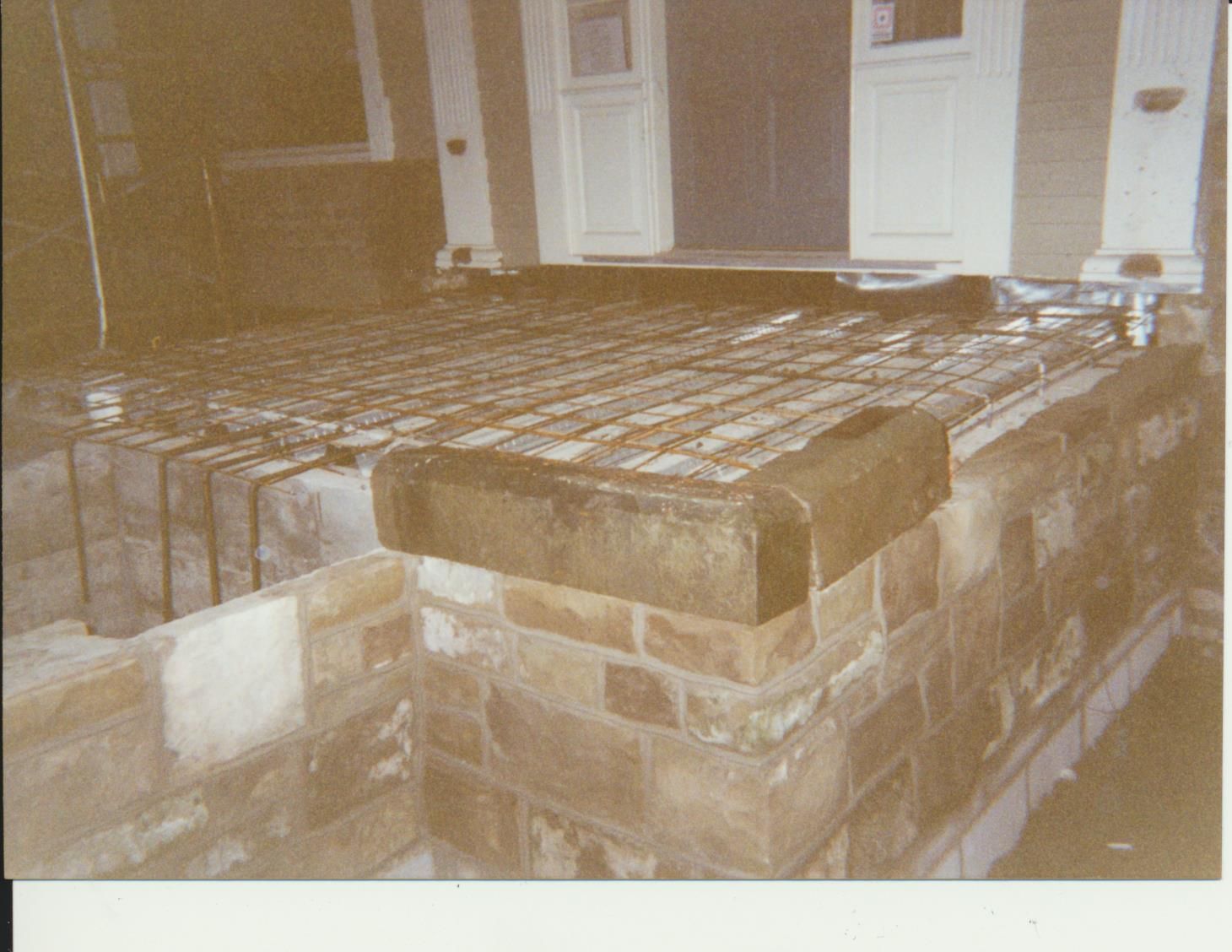 Photograph. 4 3/ 4 x 3 1/2 color. Schmidt House restoration done in December 2001. Photo by Vida Zvirzdys-Farler. Front view of house, porch reconstruction.