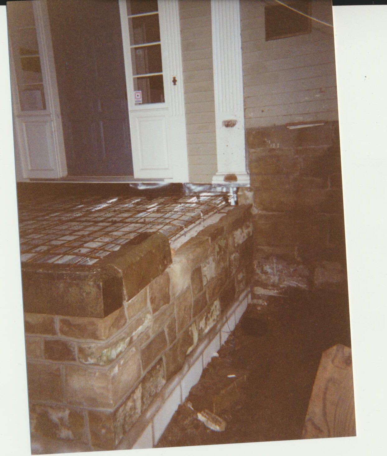 Photograph. 4 3/ 4 x 3 1/2 color. Schmidt House restoration done in December 2001. Photo by Vida Zvirzdys-Farler. Front view of house, porch reconstruction.