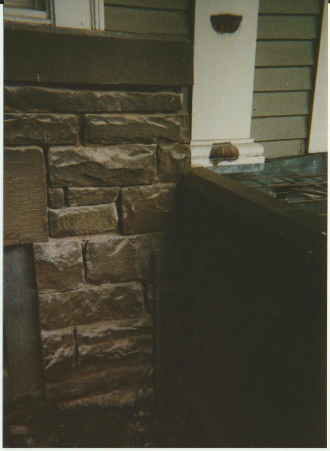 Photograph. 4 3/ 4 x 3 1/2 color. Schmidt House restoration done in December 2001. Photo by Vida Zvirzdys-Farler. View of stonework near back door.