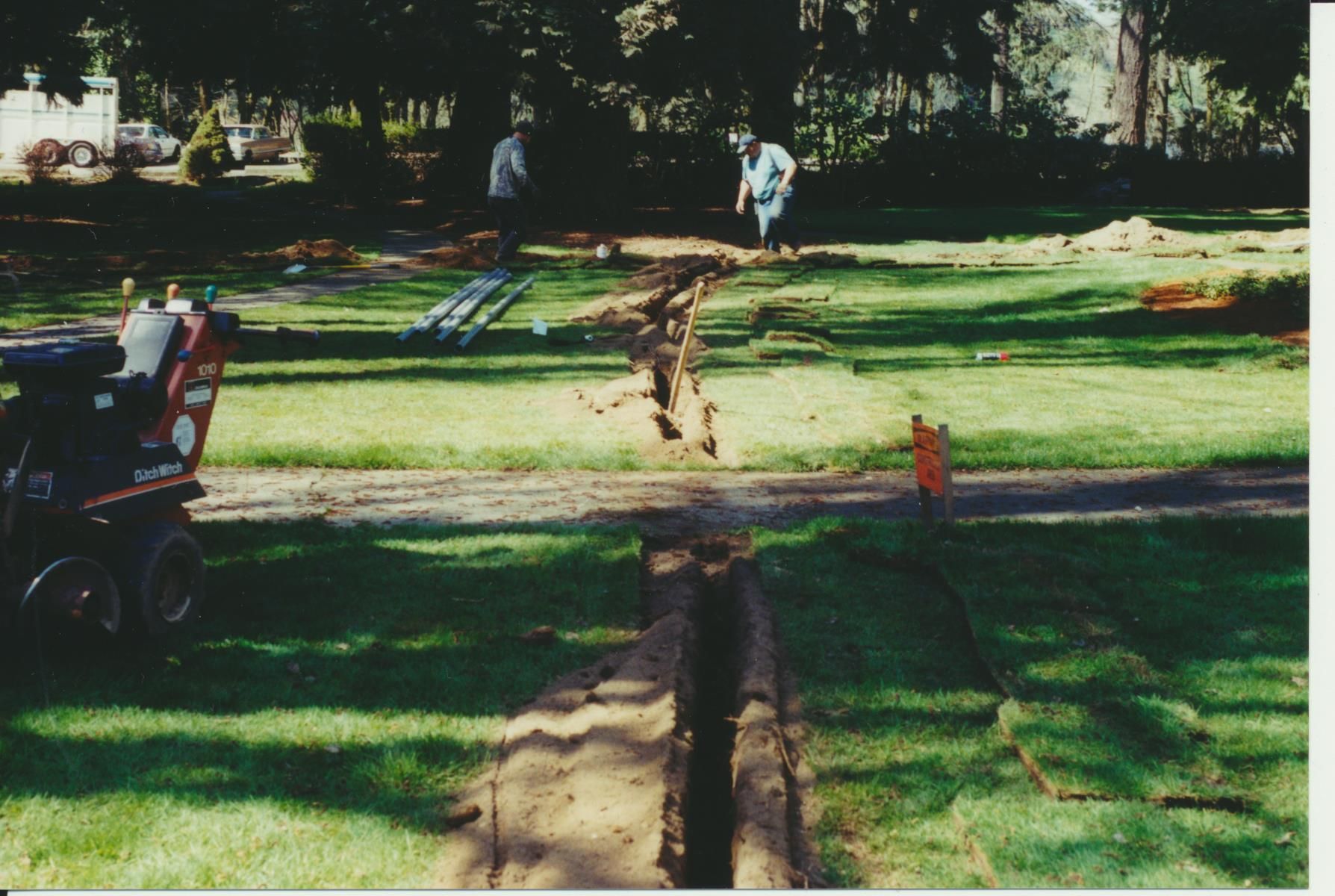 Photograph. 5 3/4 x 4 color. Schmidt House restoration done in 2001. Photo by Vida Zvirzdys-Farler. Installing underground lines.