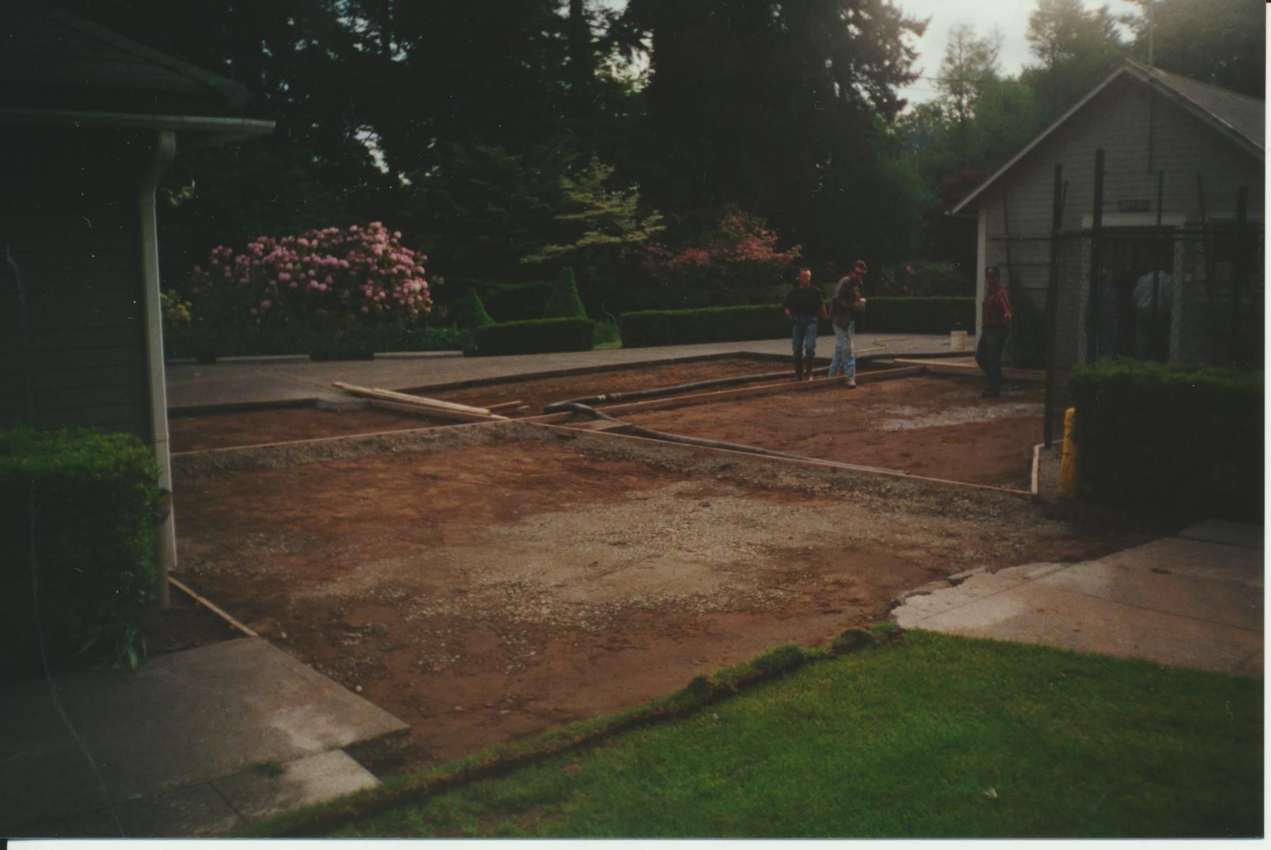 Photograph. 5 3/4 x 4 color. Schmidt House restoration done in 2001. Photo by Vida Zvirzdys-Farler. Installing new concrete carport.