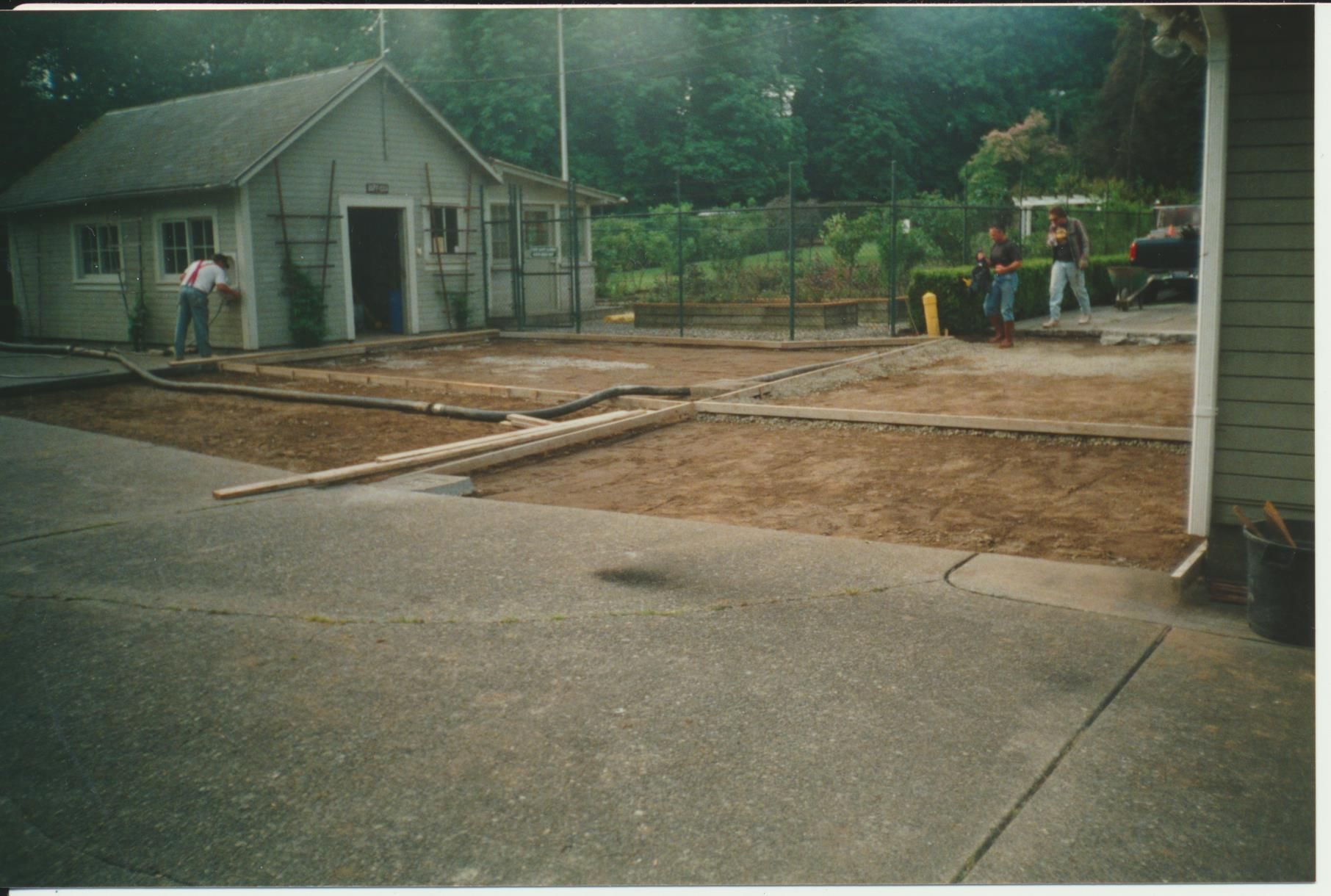 Photograph. 5 3/4 x 4 color. Schmidt House restoration done in 2001. Photo by Vida Zvirzdys-Farler. Installing new concrete carport.