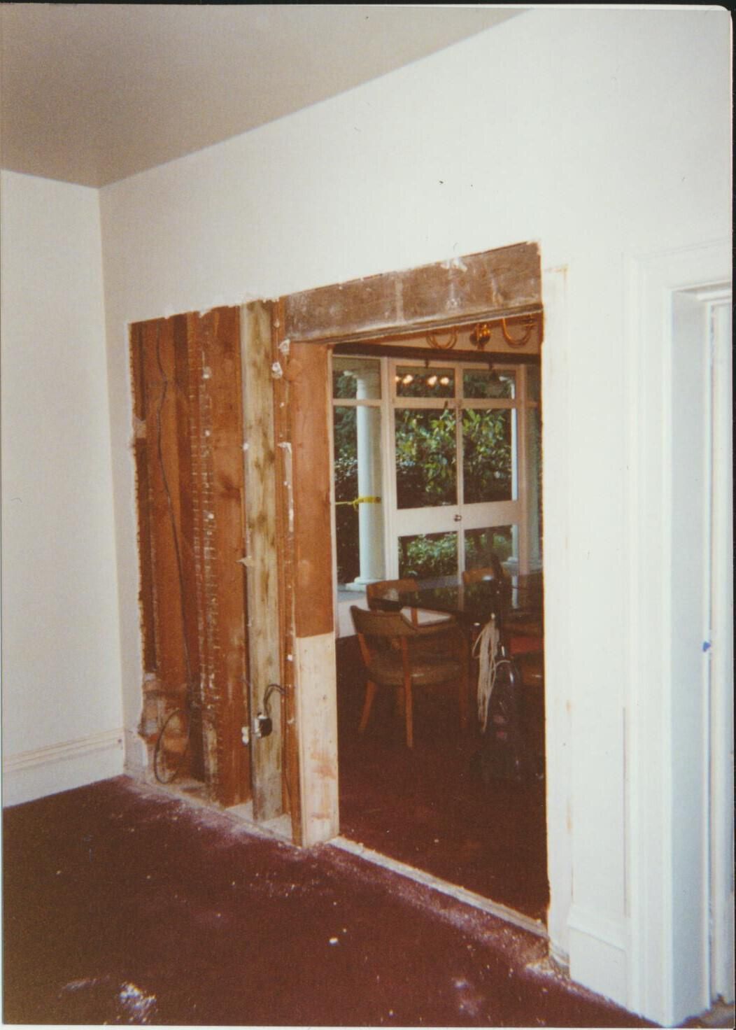 Photograph. 4 3/4 x 3 1/2 color. Schmidt House restoration done in 2001. Photo by Vida Zvirzdys-Farler. Wall additions in front/dining rooms.