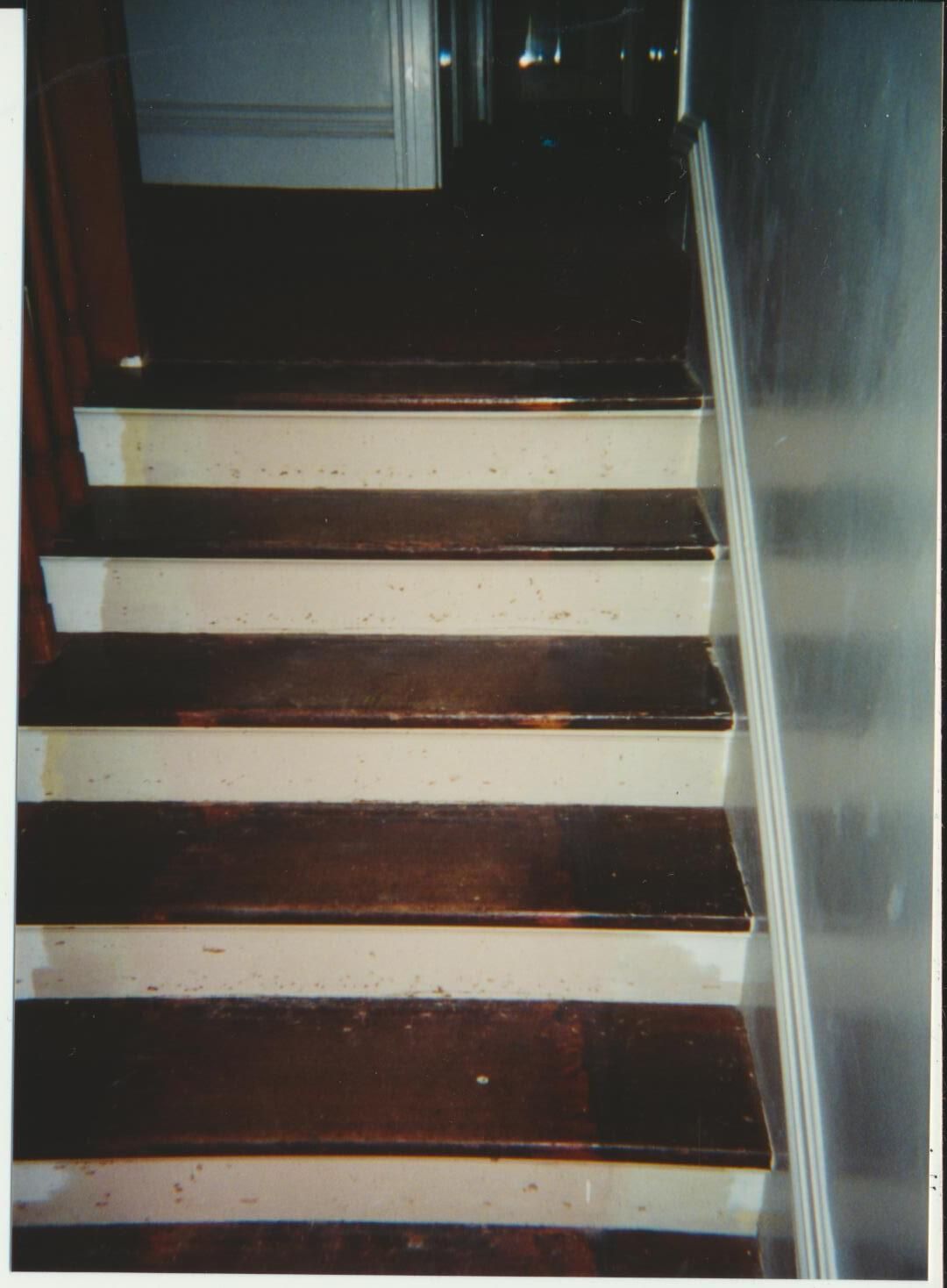 Photograph. 4 3/4 x 3 1/2 color. Schmidt House restoration done in 2001. Photo by Vida Zvirzdys-Farler. Front staircase work.