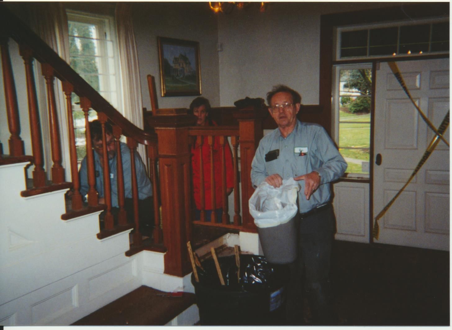 Photograph. 4 3/4 x 3 1/2 color. Schmidt House restoration done in 2001. Photo by Vida Zvirzdys-Farler. Front staircase work. Bob Crim in foreground.