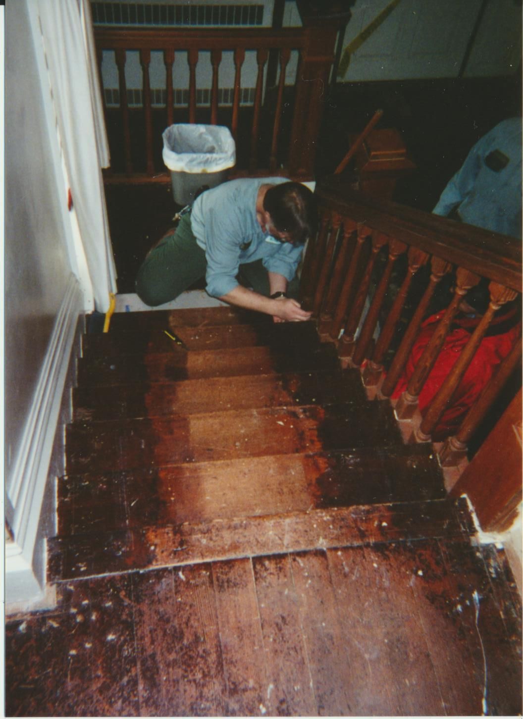 Photograph. 4 3/4 x 3 1/2 color. Schmidt House restoration done in 2001. Photo by Vida Zvirzdys-Farler. Front staircase work.
