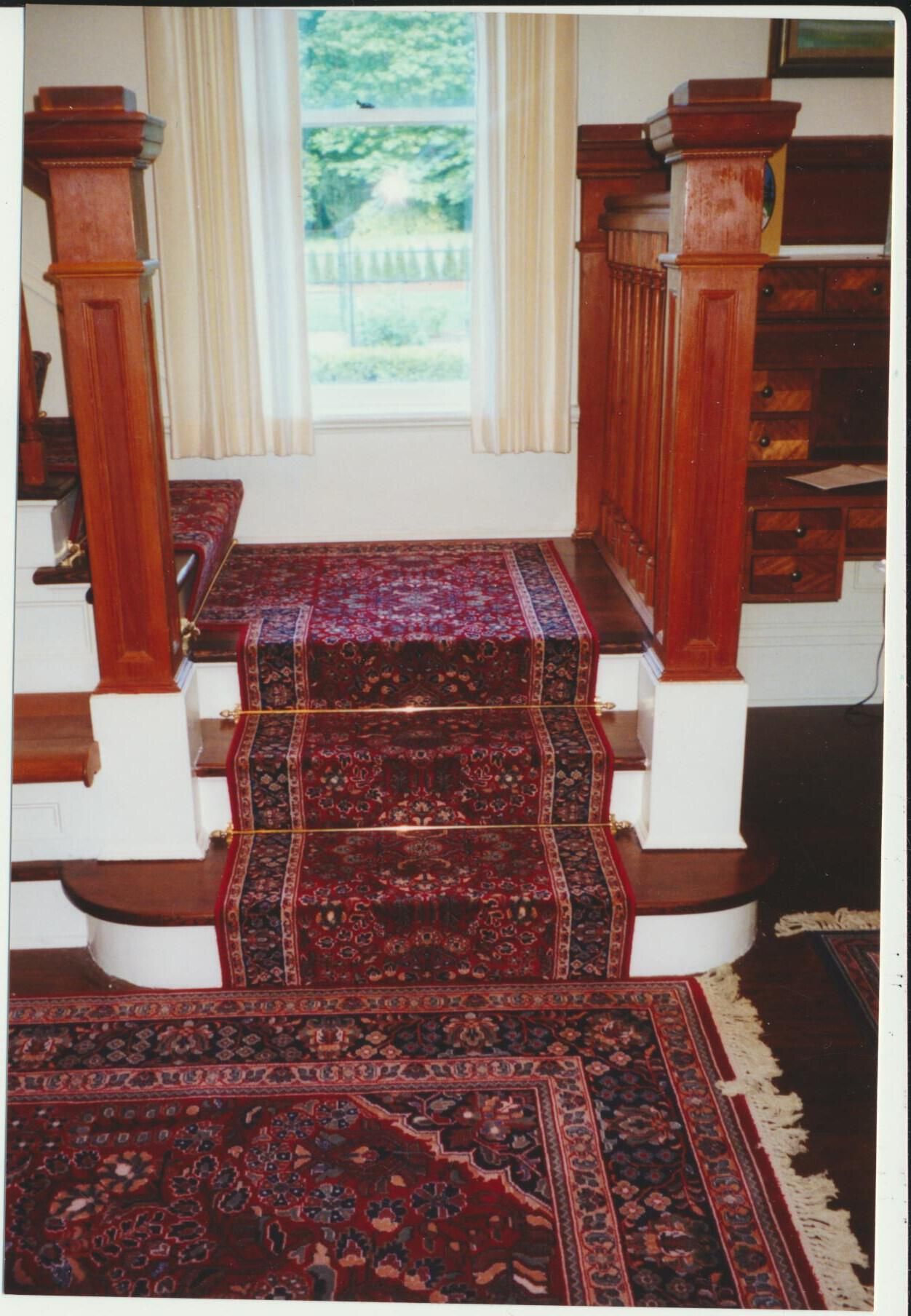Photograph. 5 3/4 x 4 color. Schmidt House restoration done in 2001. Photo by Vida Zvirzdys-Farler. Front staircase work.