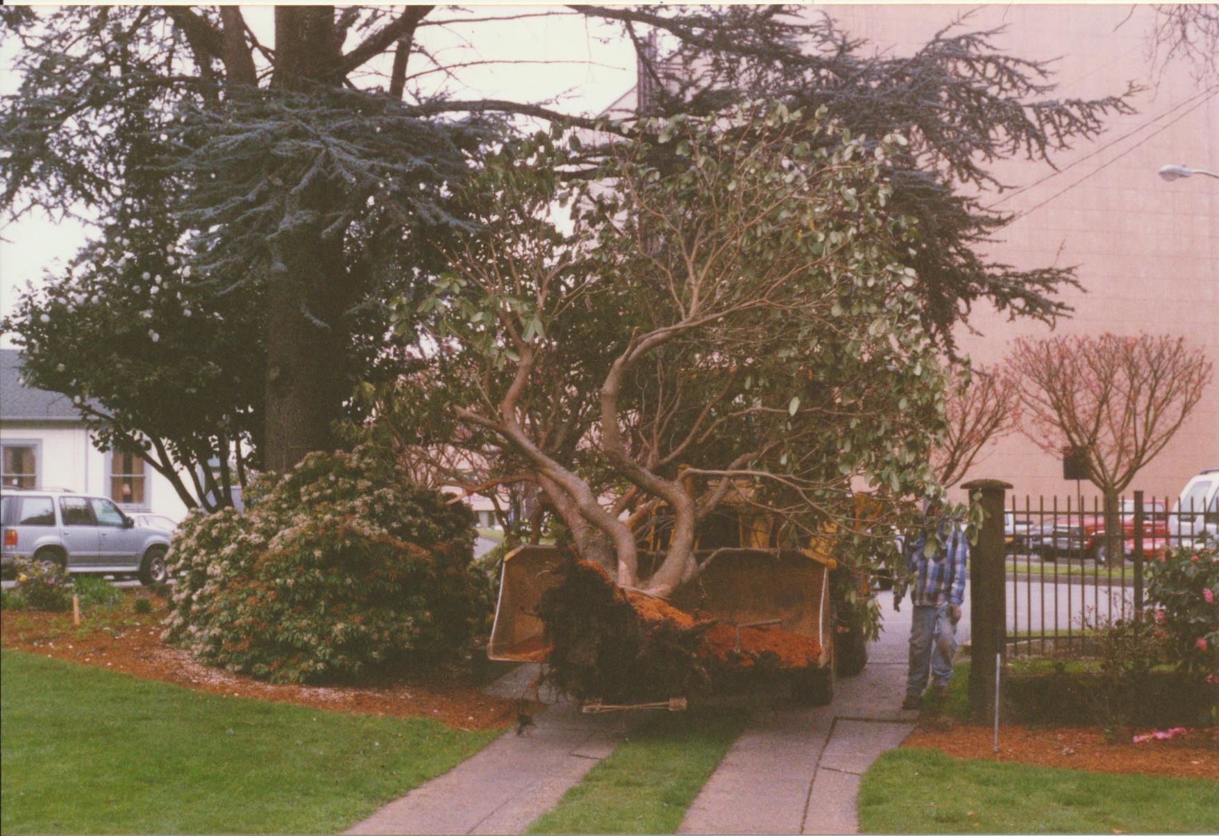 Photograph. 5 3/4 x 4 color. Schmidt House restoration done in 2001. Photo by Vida Zvirzdys-Farler. Moving a large rhododendron.