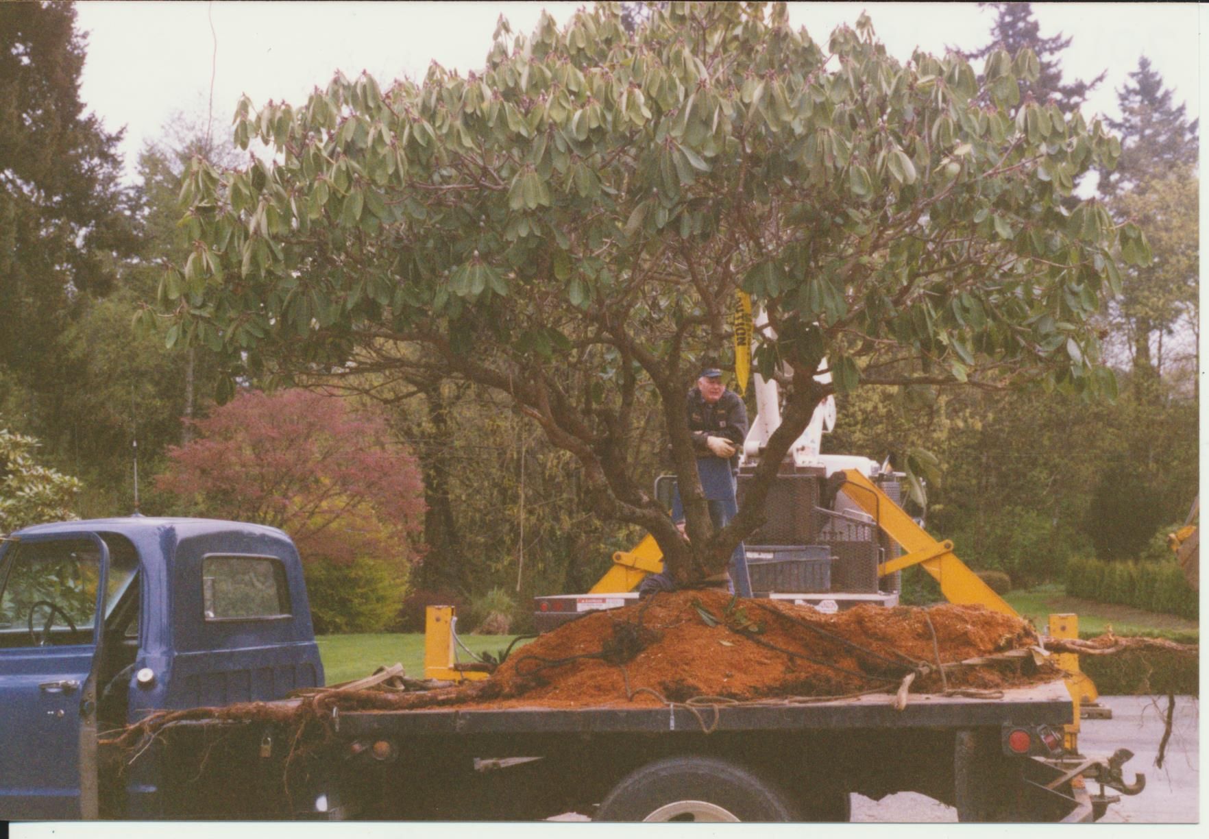 Photograph. 5 3/4 x 4 color. Schmidt House restoration done in 2001. Photo by Vida Zvirzdys-Farler. Moving a large rhododendron.