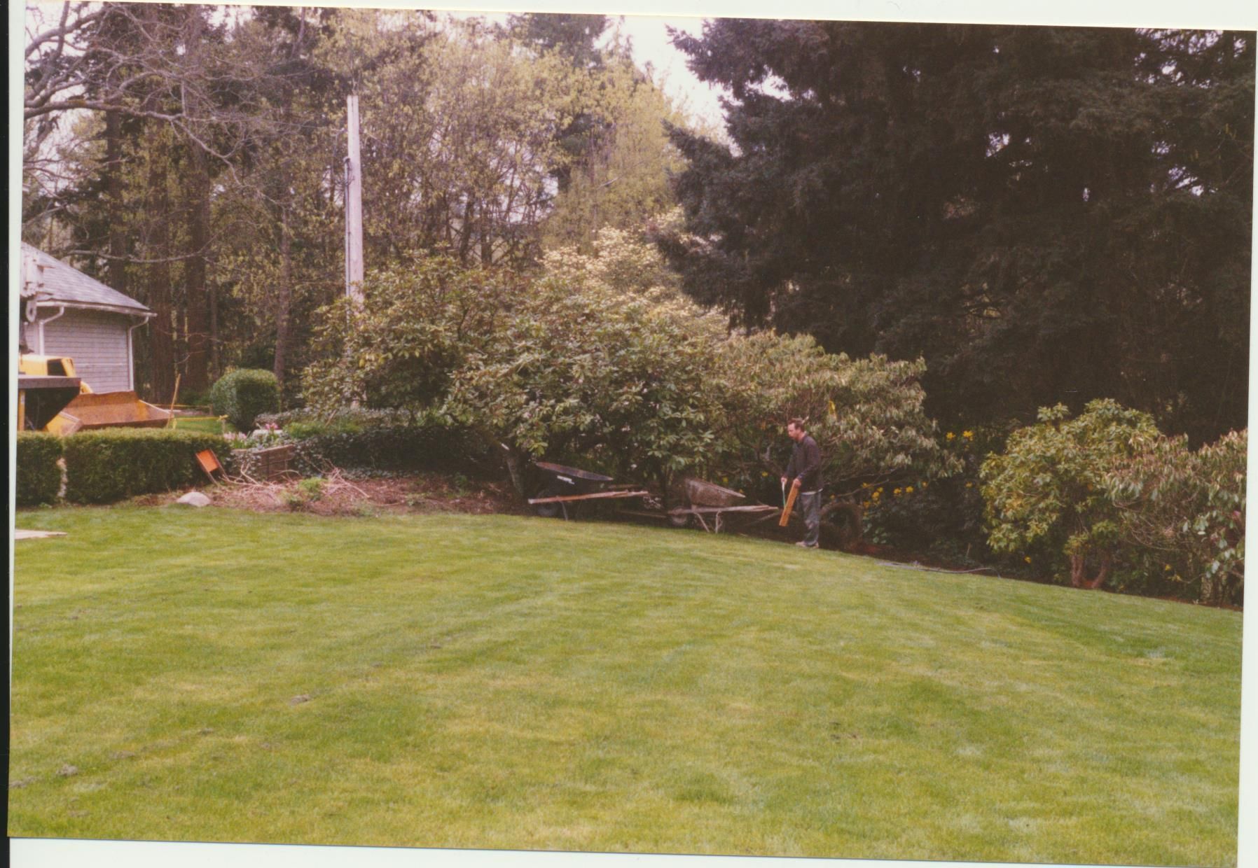 Photograph. 5 3/4 x 4 color. Schmidt House restoration done in 2001. Photo by Vida Zvirzdys-Farler. Moving a large rhododendron.
