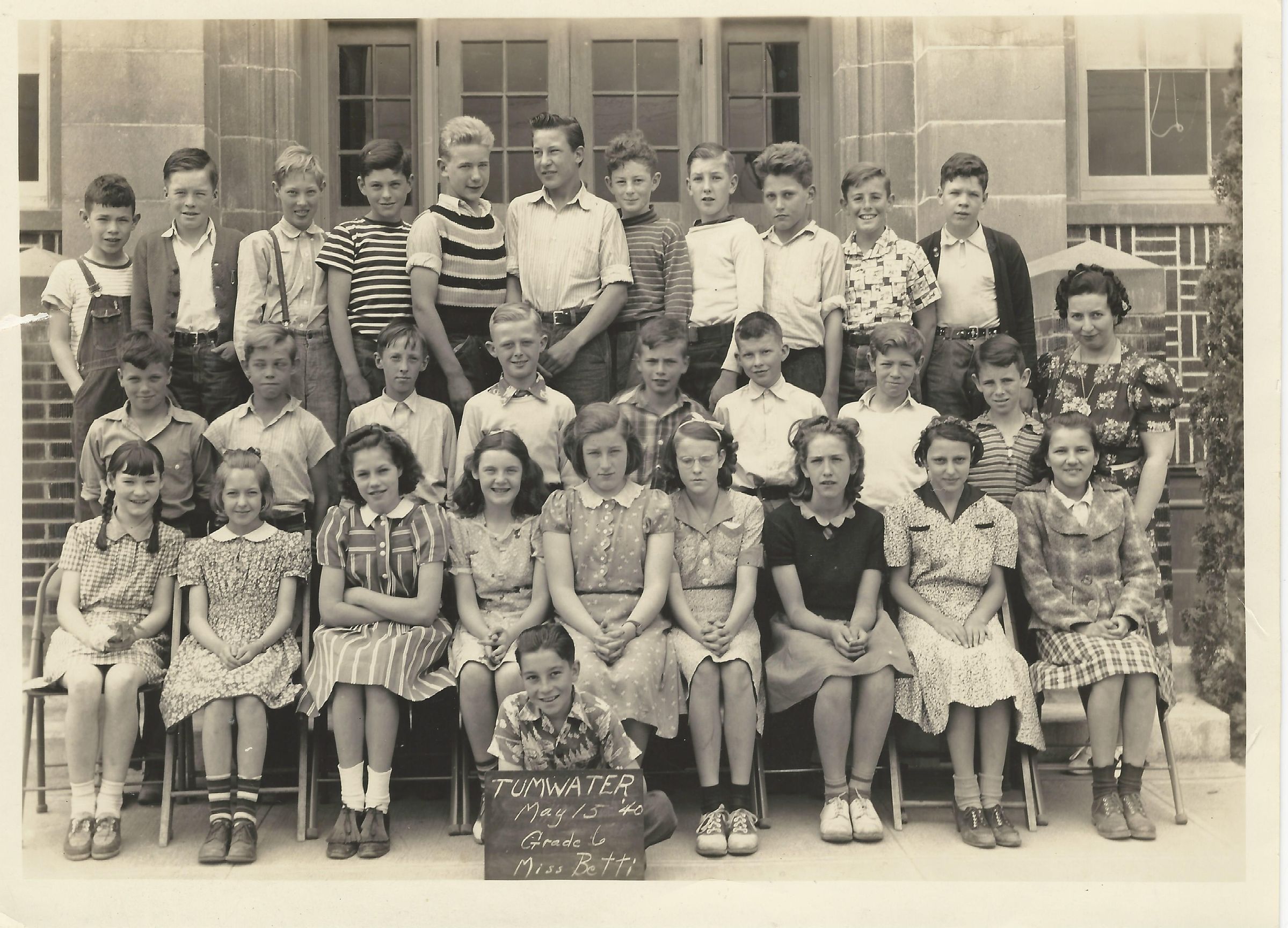Print, photographic. 7 x 5 b&w. Photo of 6th grade class, May 15, 1940, at Tumwater grade school. Teacher is Miss Betti; students not identified. Three rows of boys and girls in front of school.