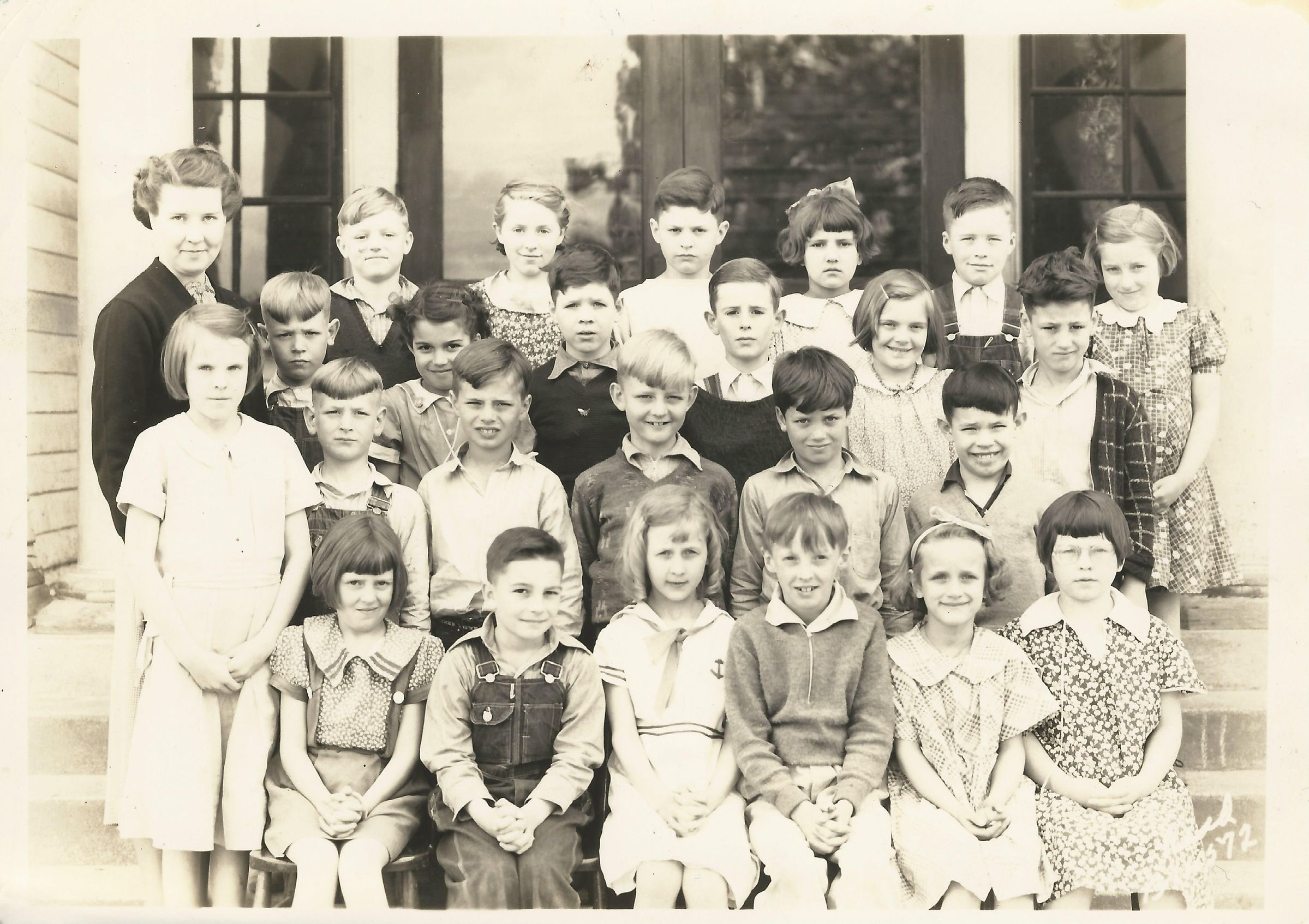 Print, photographic. 7 x 5 b&w. Photo of 3rd grade class, no year given, at Tumwater grade school. Four rows of boys and girls in front of school. Teacher is Miss Johnson. Some students identified on back of photo. Names include: John Dawley, John Becker, Teressa Seymour, Donna Williams, xx Berschauer, Colleen Leonard, Dick Martin, Frank Weber, xx Philips, Roland Besse, xx Goldsby.Name/Title