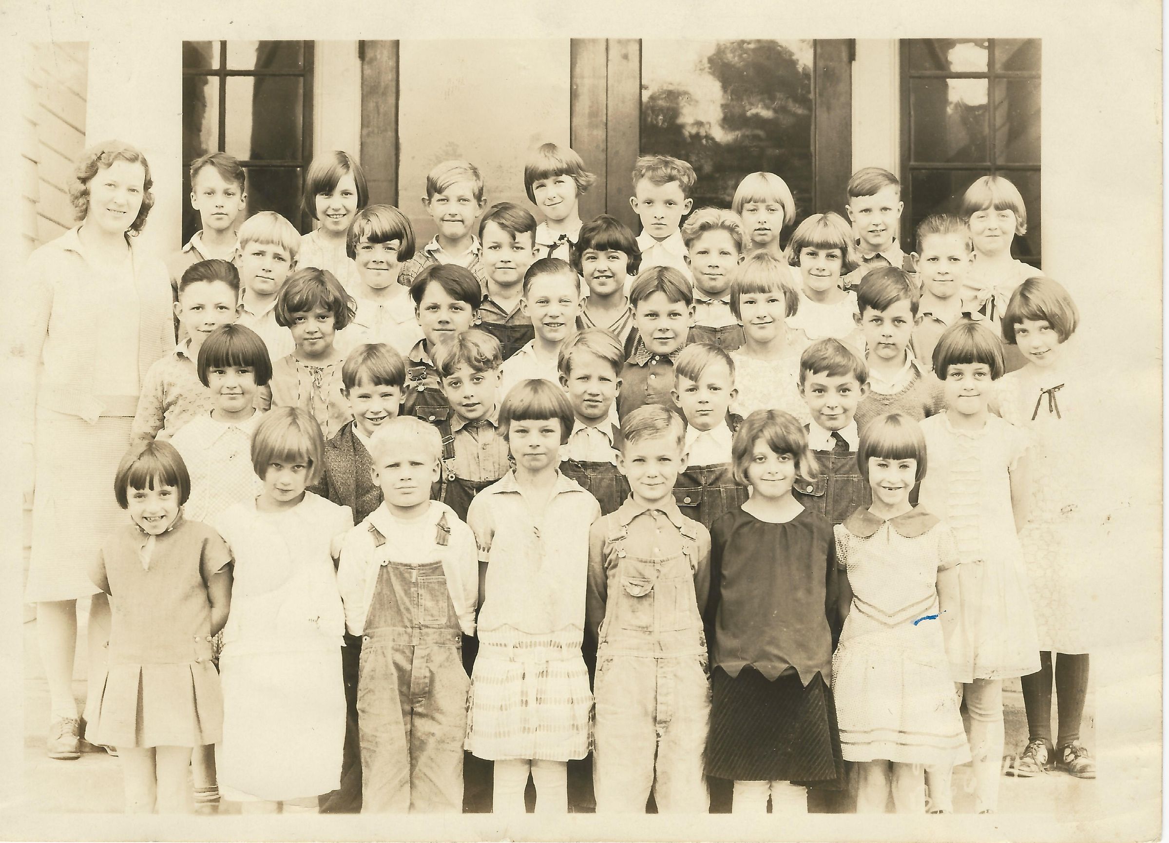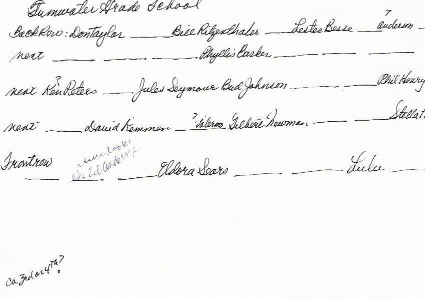 Print, photographic. 7 x 5 b&w. Photo of 2nd or 3rd grade class, no year given, at Tumwater grade school. Five rows of boys and girls in front of school. Teacher is unidentified. Some students identified on back of photo. Names include: Don Taylor, Bill Ritzenthaler, Lester Besse, xx Anderson, Phyllis Barker, Ken Peters, Jules Seymour, Bud Johnson, Phil Henry, David Remman, xx Palermo, Gilbert Newman, Stella Harnit, Zeb Anderson, Eldora Sears.Name/Title