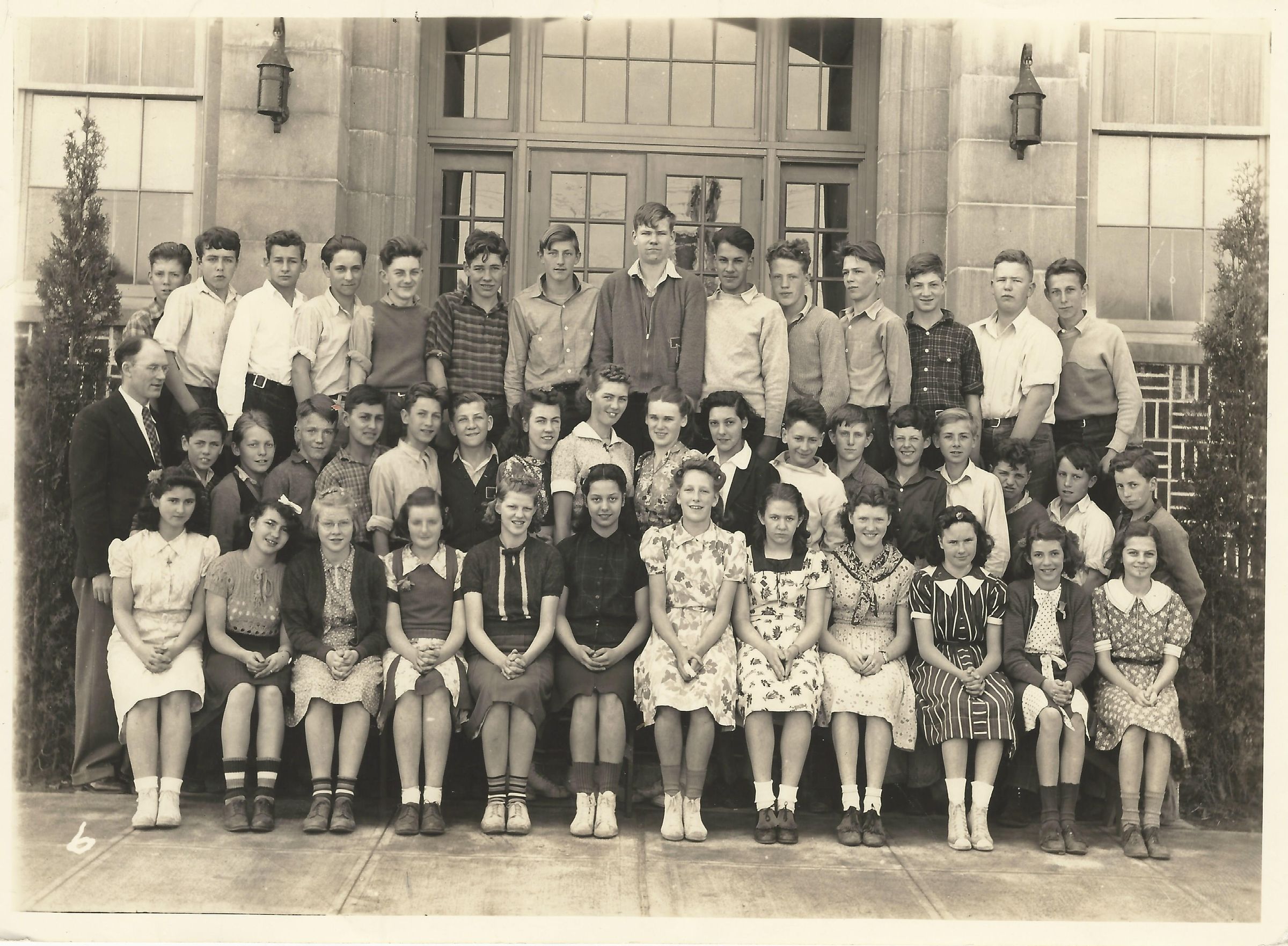 Print, photographic. 7 x 5 b&w. Photo of unknown class, no year given, at Tumwater grade school. Three rows of boys and girls in front of school. Teacher and students unidentified.