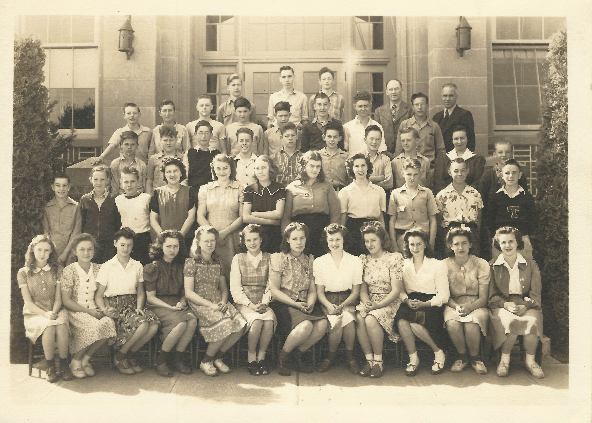 Print, photographic. 7 x 5 b&w. Photo of unknown class, no year given, at Tumwater grade school. Five rows of boys and girls in front of school. Teachers and students unidentified.