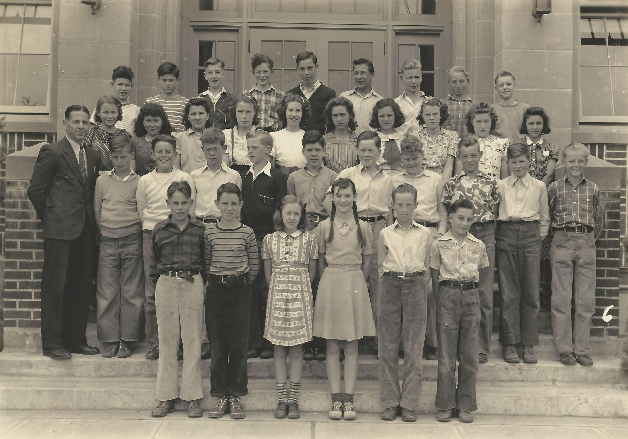 Print, photographic. 7 x 5 b&w. Photo of unknown class, no year given, at Tumwater grade school. Four rows of boys and girls in front of school. Teacher and students unidentified.