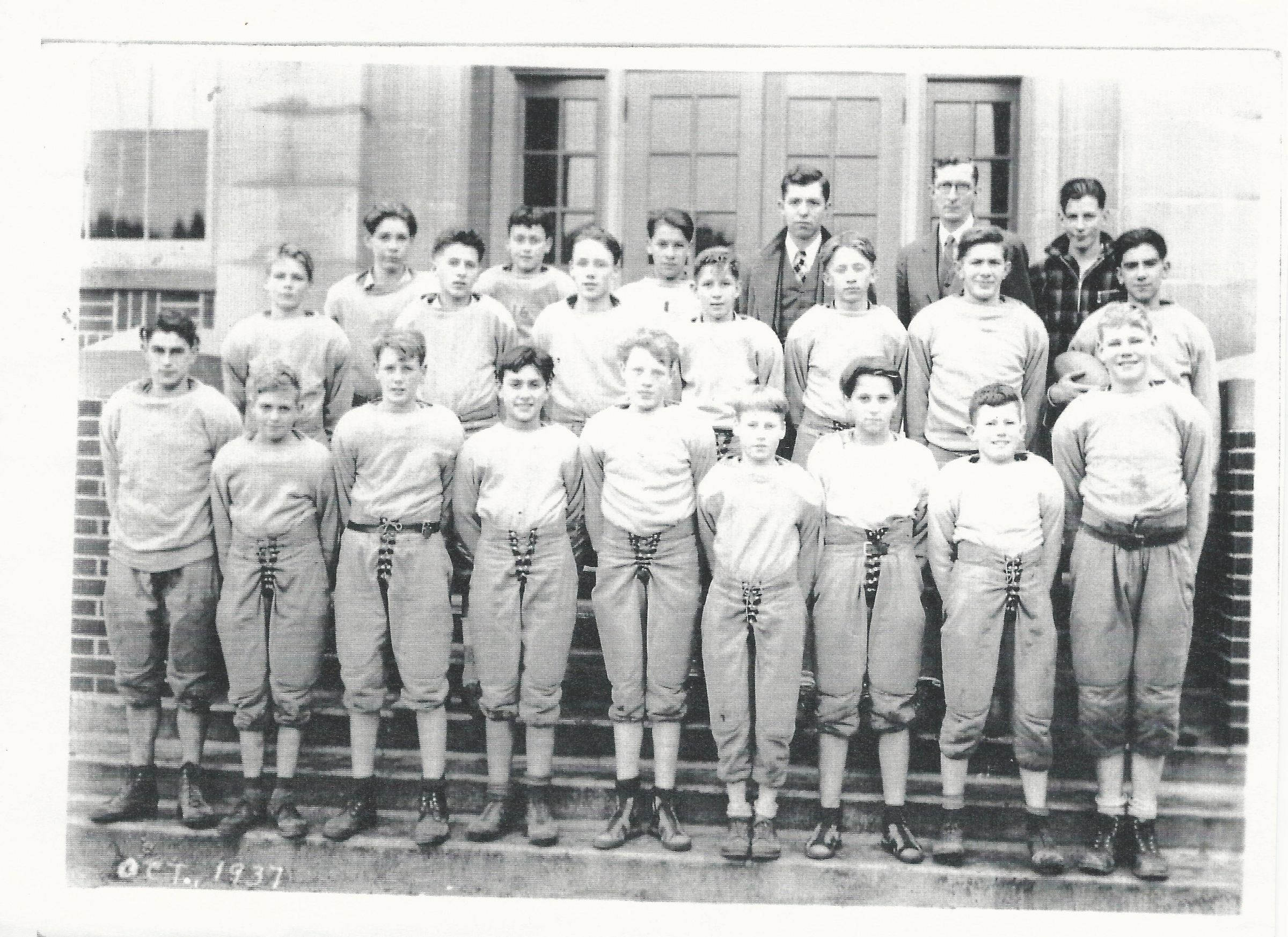 Photocopy. 7 x 5 b&w. Photo of football team, October 1937, at Tumwater grade school. Three rows of boys in football uniforms in front of school. Teacher/coach and students unidentified.
