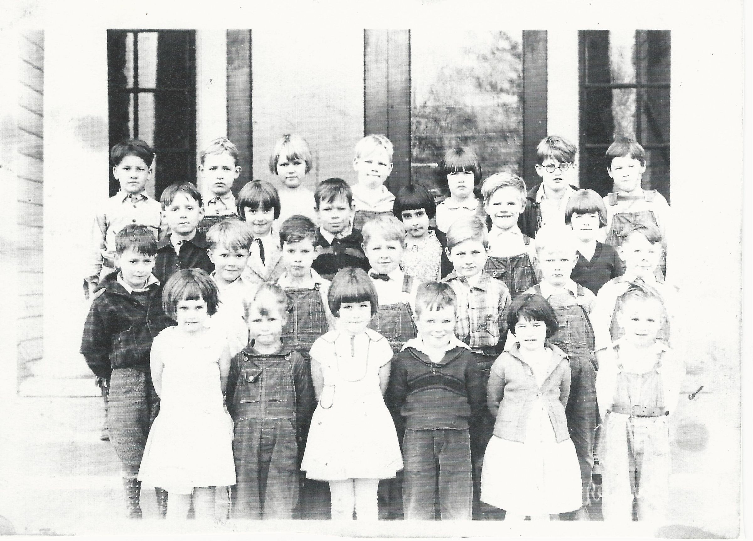 Photocopy. 7 x 5 b&w. Photo of unknown class, unknown year, at Tumwater grade school. Four rows of boys and girls in front of school. Students unidentified.