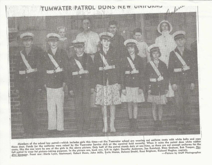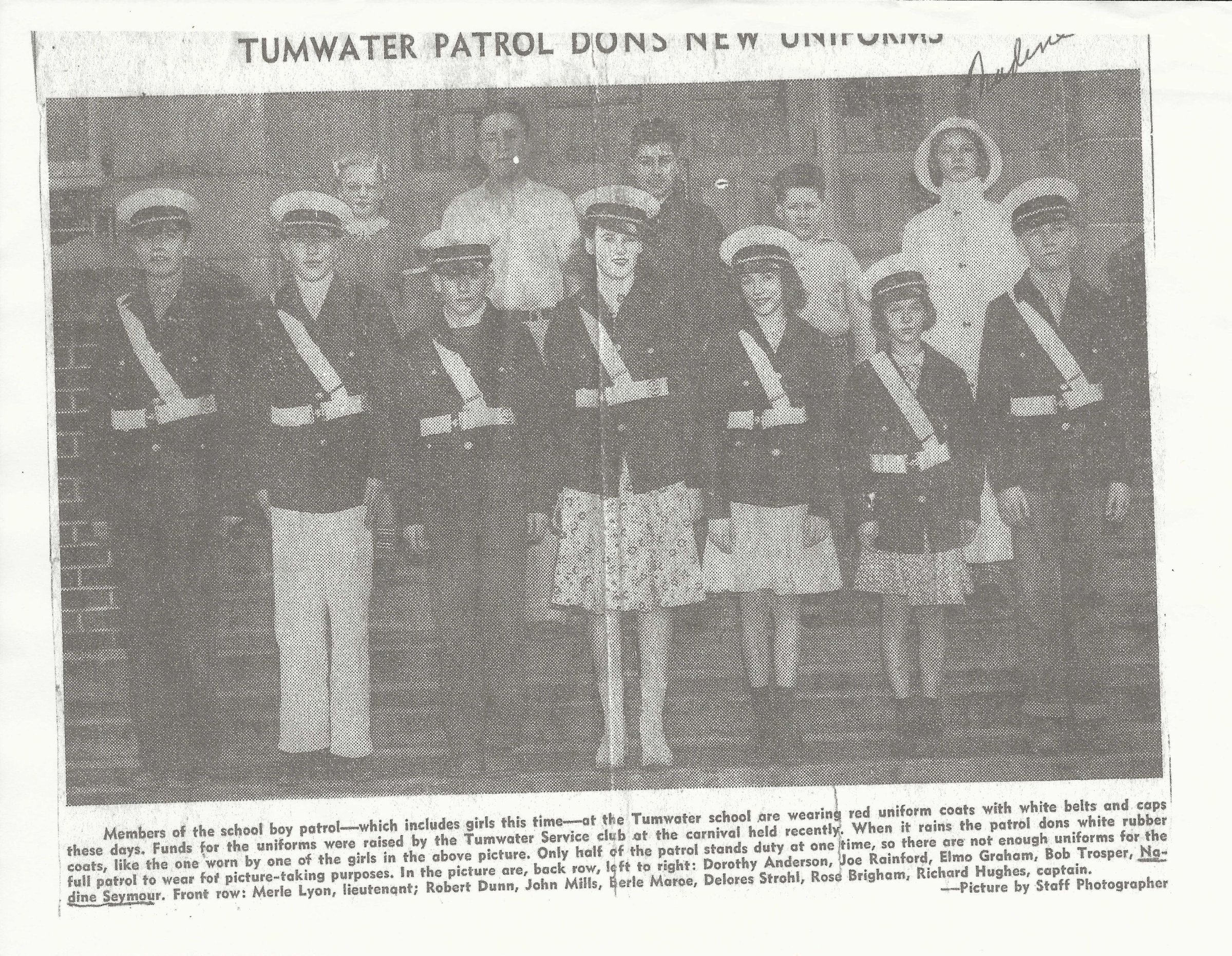 Photocopy. 8 x 5 b&w. Photo of Tumwater school patrol in new uniforms. From March 14, 1939 issue of Morning Olympian newspaper. Students include: Dorothy Anderson, Joe Rainford, Elmo Graham, Bob Trosper, Nadine Seymour, Merle Lyon, Robert Dunn, John Mills, Berle Moroe, Delores Strohl, Rose Brigham, Richard Hughes.Name/Title