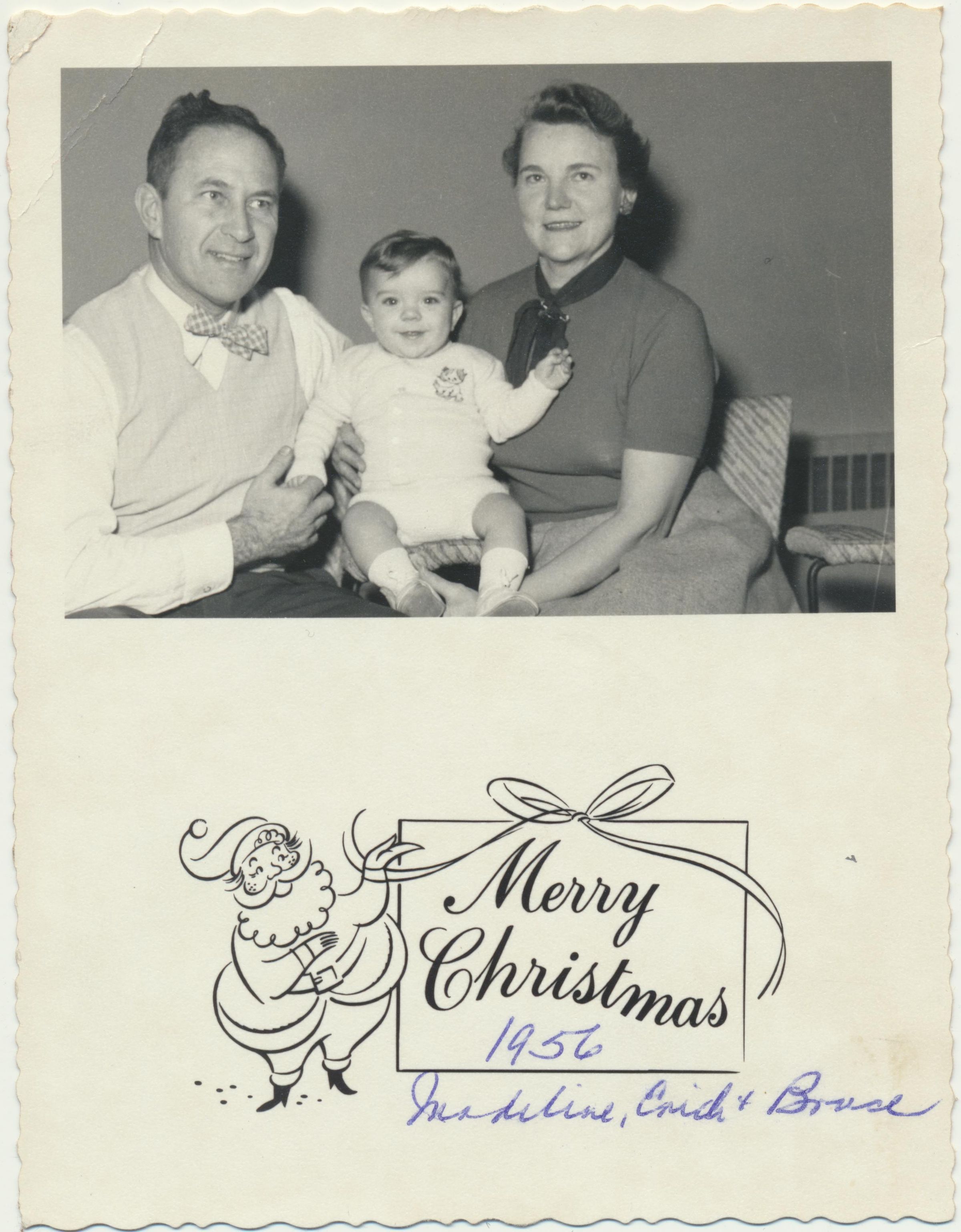 Print, photographic. 4 1/4 x 5 1/2, b/w. Christmas card from Madeline, Cindi and Bruce (no last name noted) to Helen Shank. Helen Shank owned/operated Trails End Ranch near Olympia Airport. See biography for other info.Name/Title