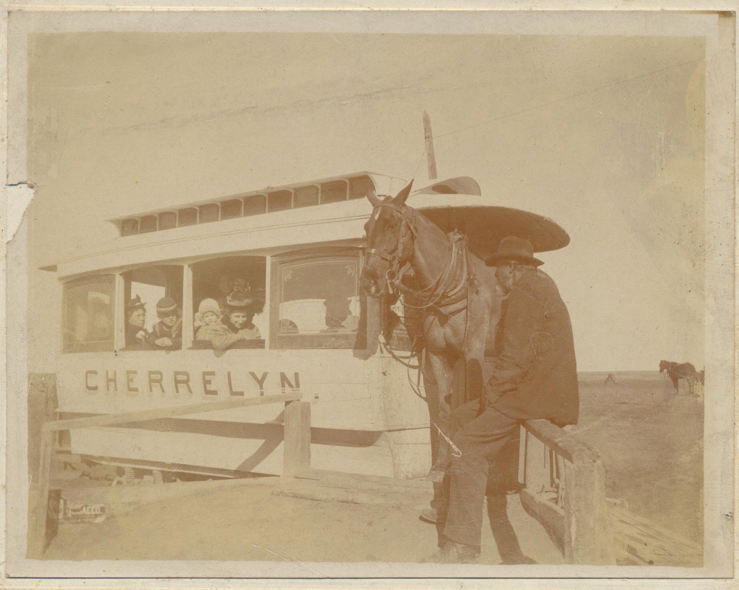 Taken in Denver, Colorado. From History of Colorado website: "The Cherrelyn Line was built in 1883 by the Southside Investment Company and operated until 1910. The horse was hitched to a single car at Hampden and Broadway. It pulled the car up one-and-a-half miles of track on a steep Broadway hill. At the height of the run was a small shopping community called Cherrelyn. At this point the horse was unhitched and led to the back of the car where it was backed onto a platform. Harnessing gravity, the horse and passengers would coast back to the route's starting point. The trip up the hill took fifteen minutes while the ride back down took only three. The fare was five cents in 1883, but after some time was increased to a dime."