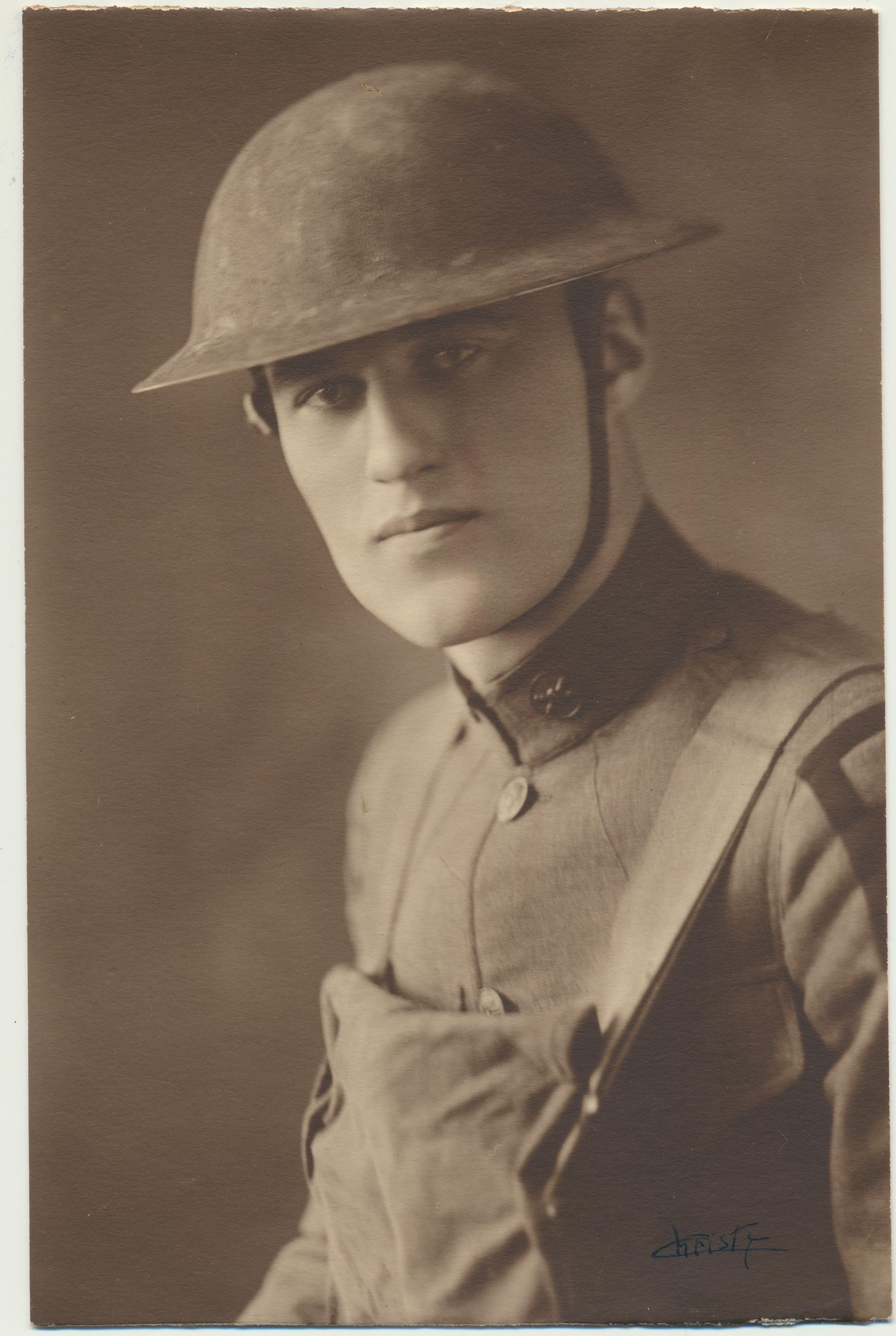 Print, photographic. 4 1/2 x 7 sepia. Portrait of young man in WWI military uniform and helmet. Although photo is not identified, it is Edward Alonzo Swift, Jr., Helen Shank's first husband.
