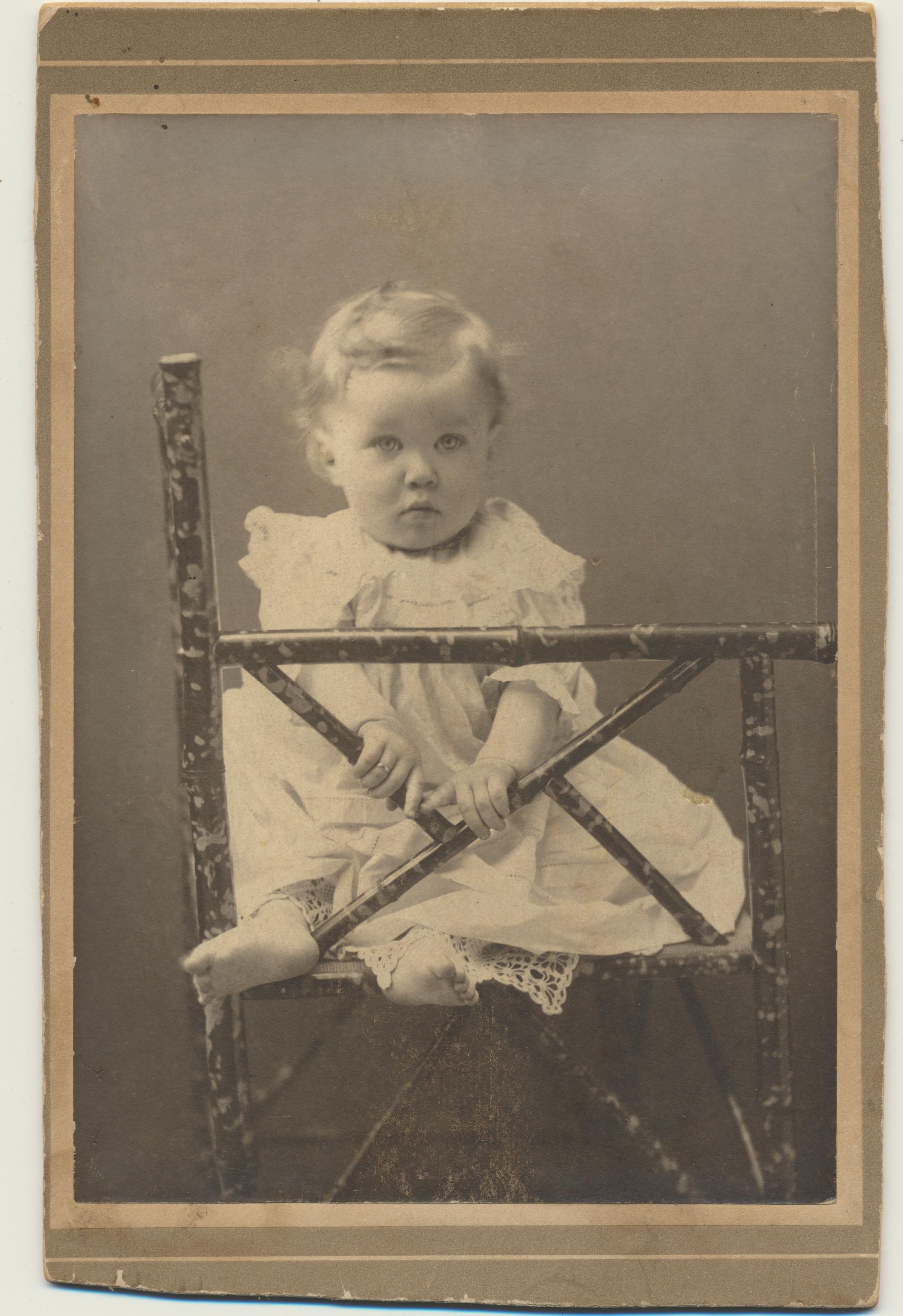 Print, photographic. 4 x 5 1/2 sepia. Portrait of baby girl (toddler) in white dress, seated in chair. Although photo is not identified, it is likely Helen Shank.