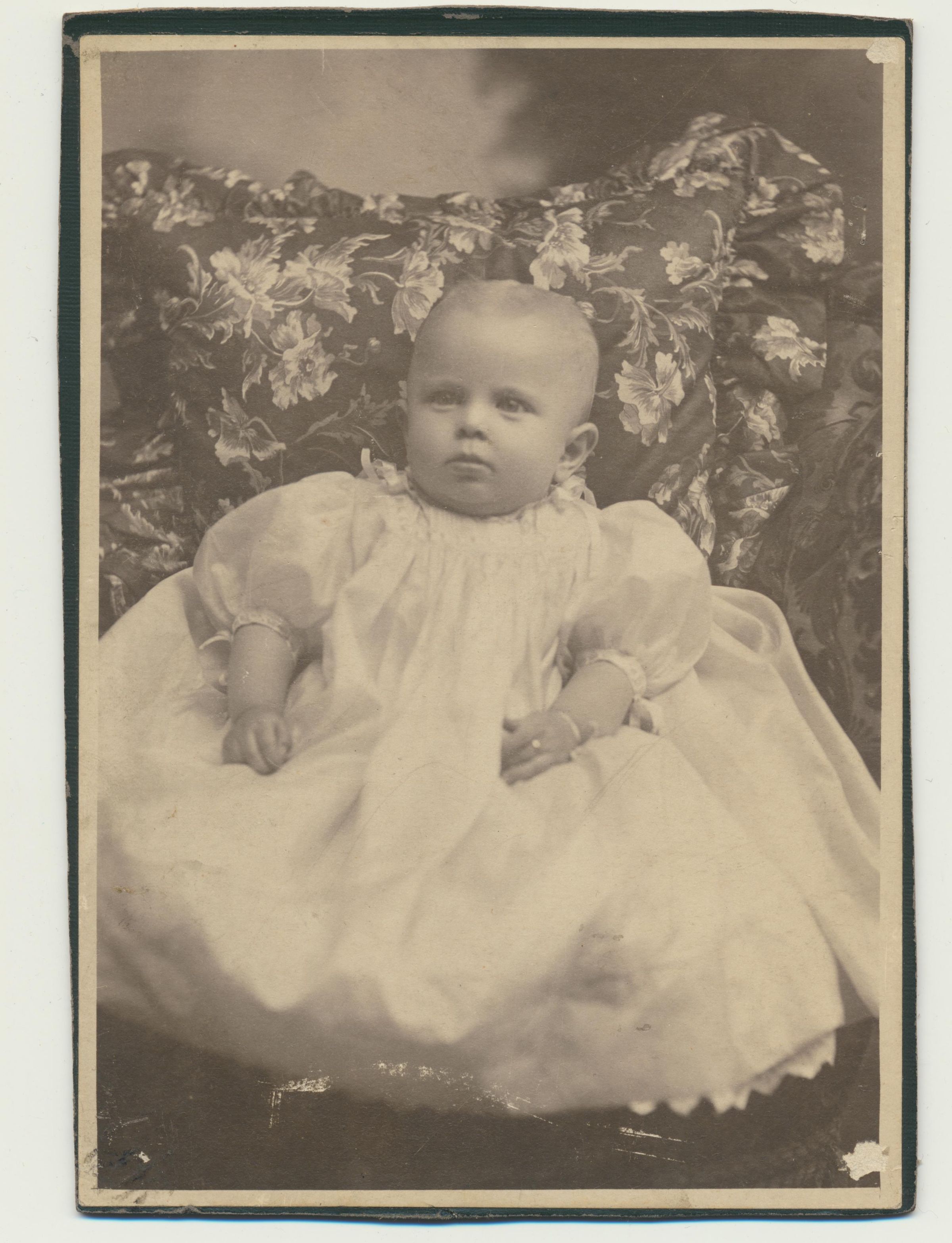 Print, photographic. 3 3/4 x 5 1/2 sepia. Portrait of baby girl (?) in white dress, seated in chair with floral print pillow behind. Photo is not identified.