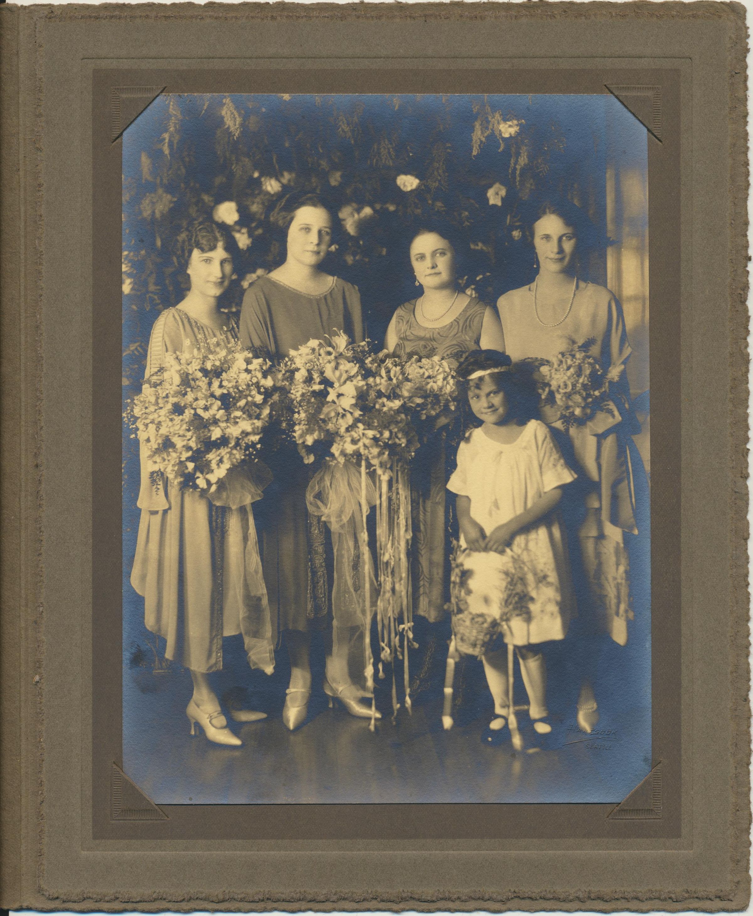 Print, photographic. 6 x 8 sepia, in studio folder marked "Hartsook, Seattle." Portrait of unknown wedding party. Helen Shank is third from left. Others not identified. Likely 4 bridesmaids and flower girl.