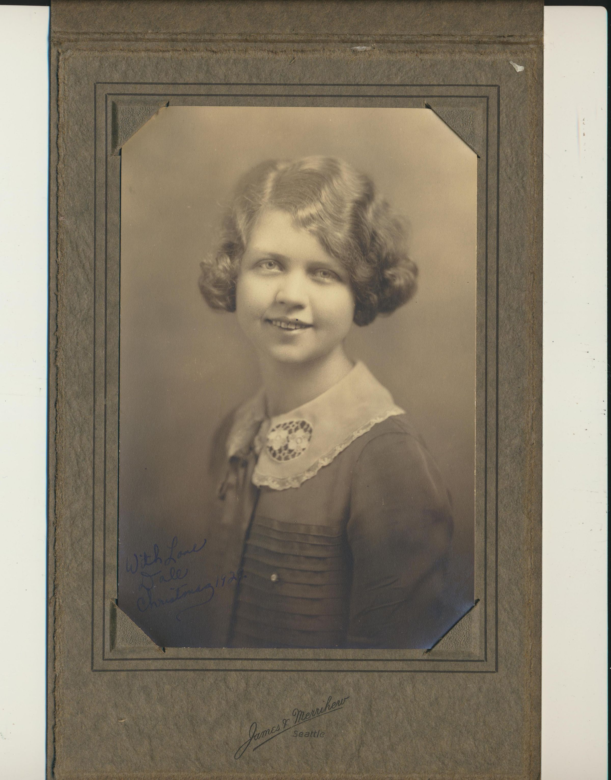 Print, photographic. 4 x 6 sepia, in studio folder marked "James & Merrihew, Seattle." Signed in lower left "With Love Dale Christmas 1922."