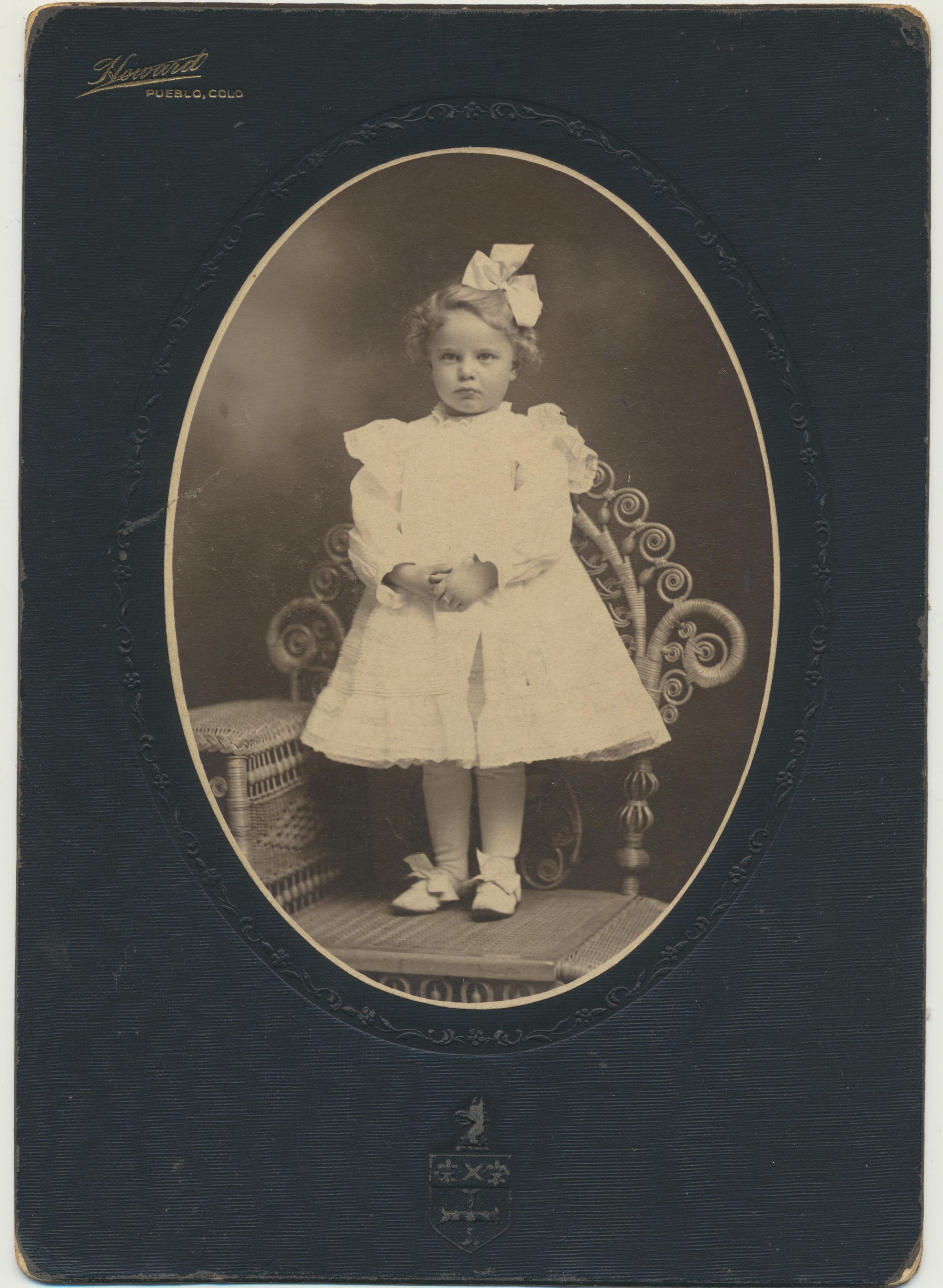 Print, photographic. 3 1/2 x 5 oval sepia, on cardboard backing. Backing marked "Howard, Pueblo, Colo." Portrait of young girl standing on wicker chair. Not identified, but likely Helen Shank.