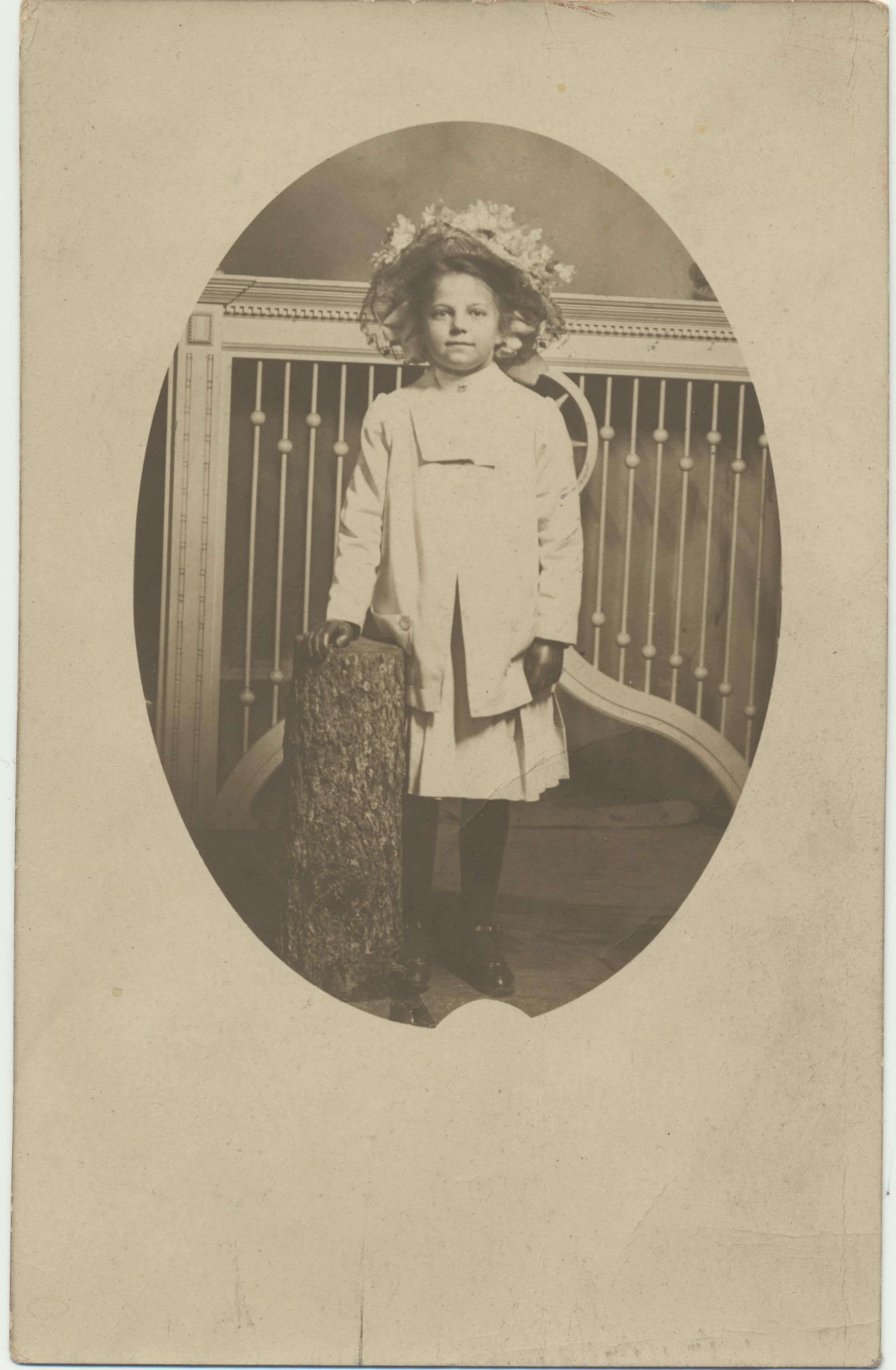 Print, photographic. 2 1/2 x 3 1/2sepia. Portrait of young girl dressed in coat and fancy hat, standing in front of screen or railing. Helen Shank. Printed on postcard back, inscribed "Do you know who I am?"