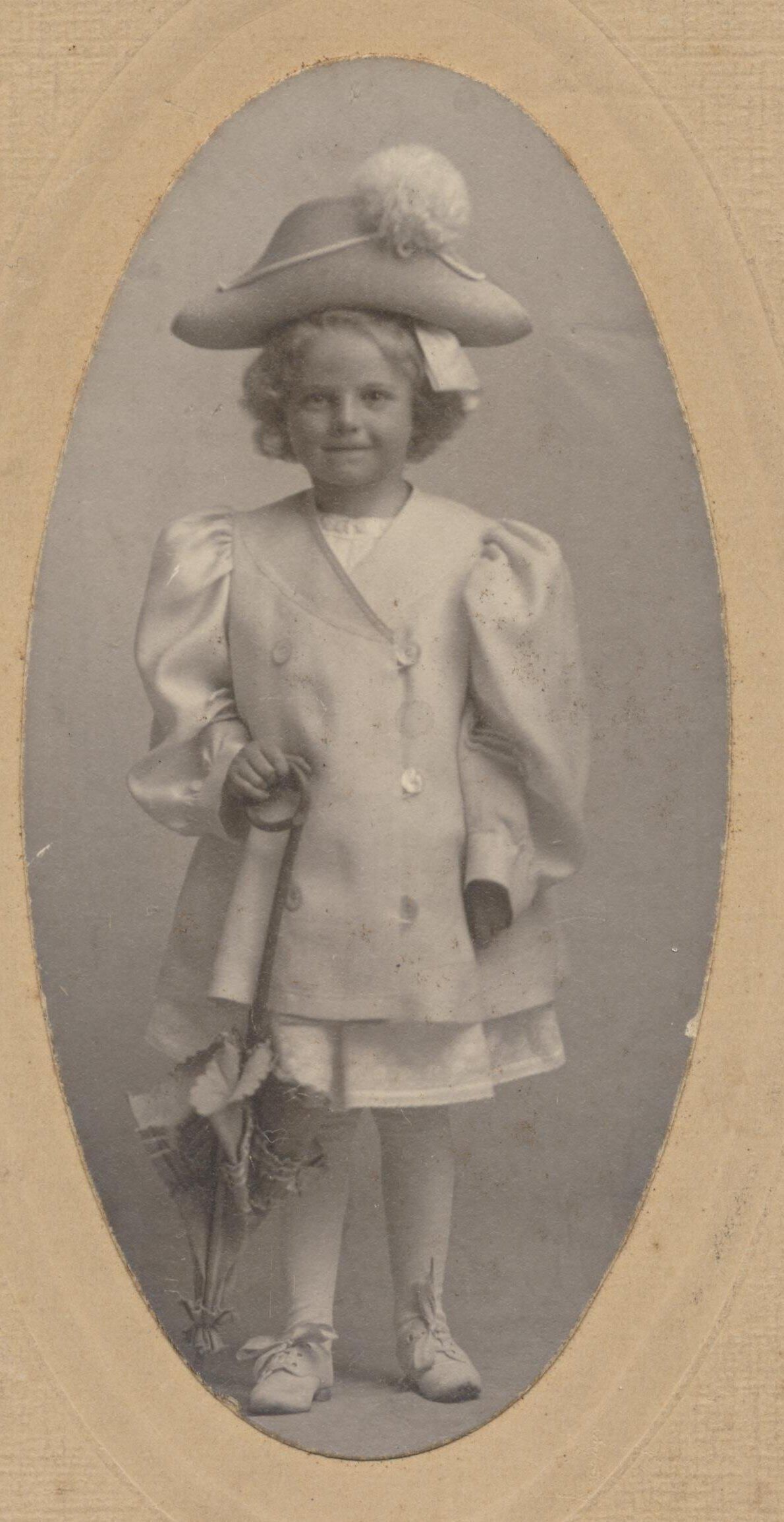 Print, photographic.1 3/4 x 3 1/2 oval sepia. Portrait of young girl dressed in coat and fancy hat, carrying furled umbrella. Helen Shank.