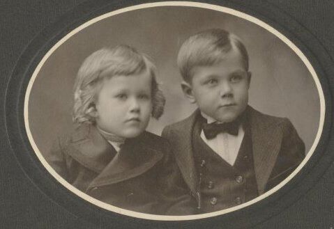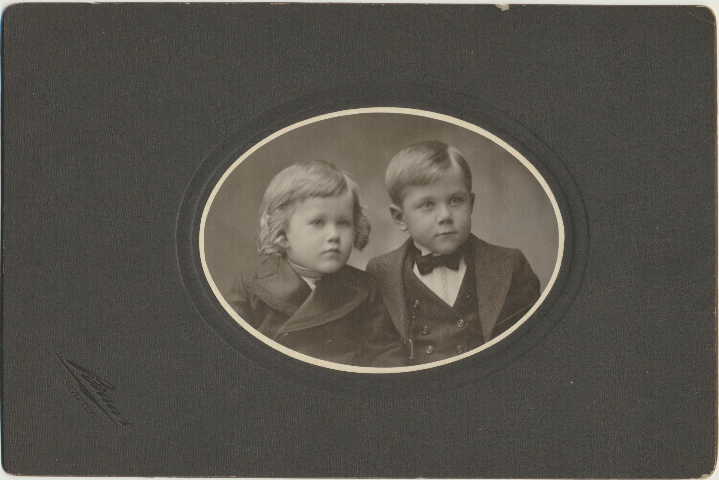 Print, photographic.4 1/2 x 3 oval sepia, on cardboard backing. Portrait of unidentified young girl and young boy.