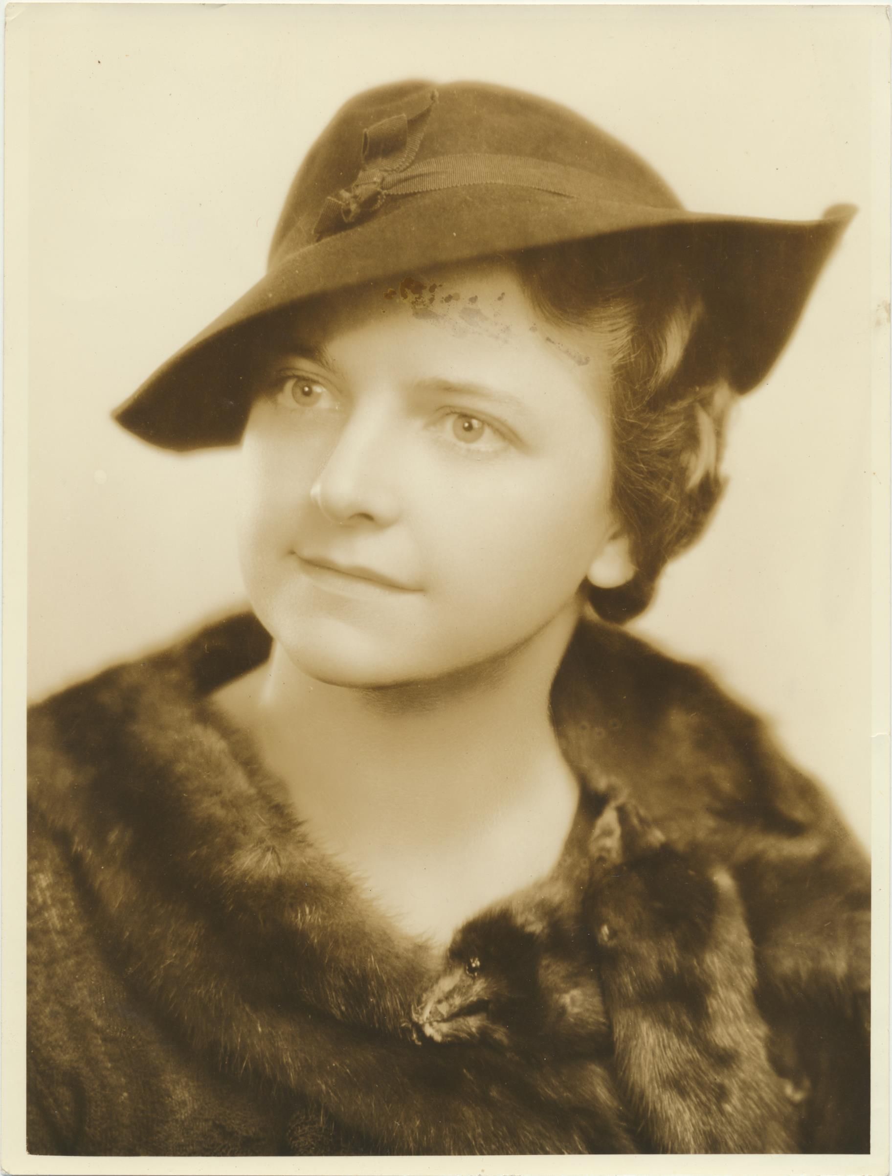 Print, photographic. 6 x 8 sepia. Portrait of Helen Shank in fur coat or stole. On back is stamped "Photo by Grady please credit."